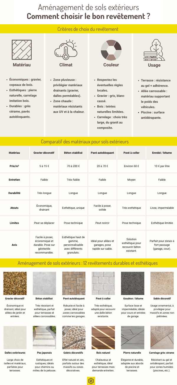 Le choix du revêtement doit tenir compte de l’environnement dans lequel vous vivez. Dans une région pluvieuse, privilégiez des matériaux drainants comme le gravier ou le béton poreux. Dans les zones chaudes, préférez des surfaces résistantes aux UV. De plus, vos habitudes d’utilisation (repas en terrasse, jeux pour enfants, stationnement) influencent directement le choix du matériau le plus adapté.