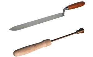 Le grattoir à cadre est spécialement conçu pour nettoyer les faces et les rainures de chacun de vos cadres. Cette opération est essentielle si vous souhaitez réutiliser ceux-ci. Une fois chauffé à la flamme, l'éperon-bloc vous permettra d'incruster de la cire sur les fils de vos cadres. Il s'agit là aussi d'une opération essentielle pour les réutiliser.