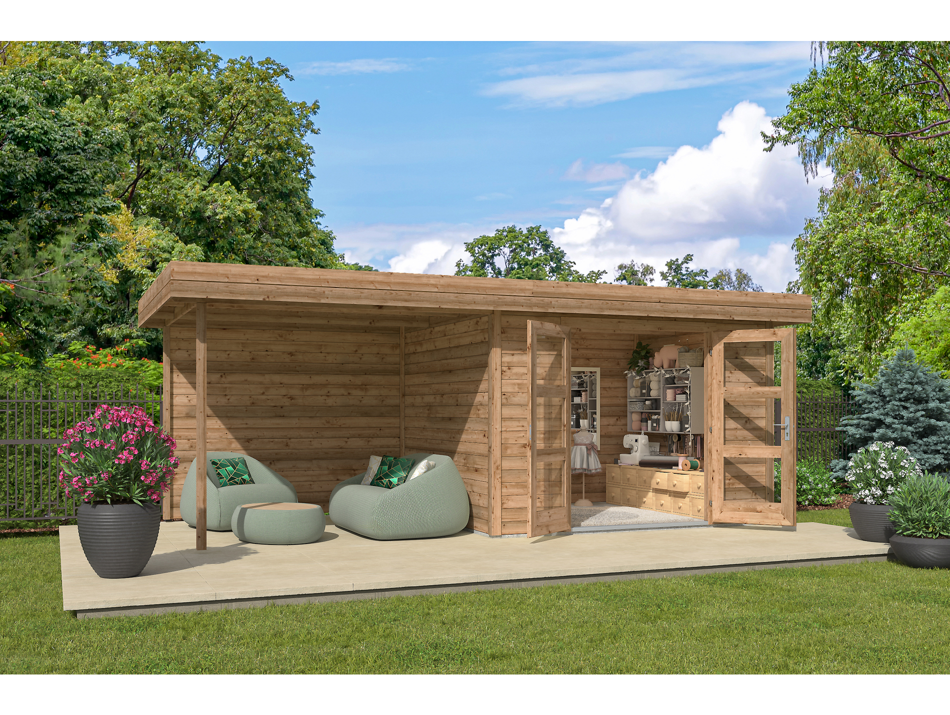 Son toit plat avec extension et paroi arrière crée un espace complémentaire appréciable au quotidien. Cette conception apporte davantage de possibilités d'aménagement selon les besoins, que ce soit pour stocker, s'installer ou profiter d'un espace abrité dans le jardin.
