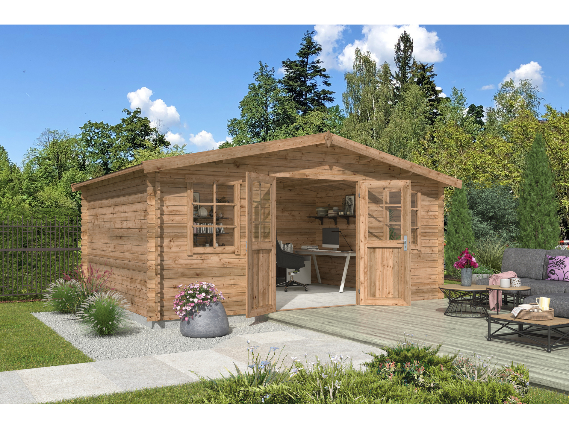 L'abri de jardin ISOLA en bois offre une surface généreuse pour organiser le rangement du matériel de jardin, des outils ou des équipements encombrants. Avec sa surface utile de 17,62 m², il permet d'aménager un espace intérieur confortable et fonctionnel pour différents usages extérieurs.
