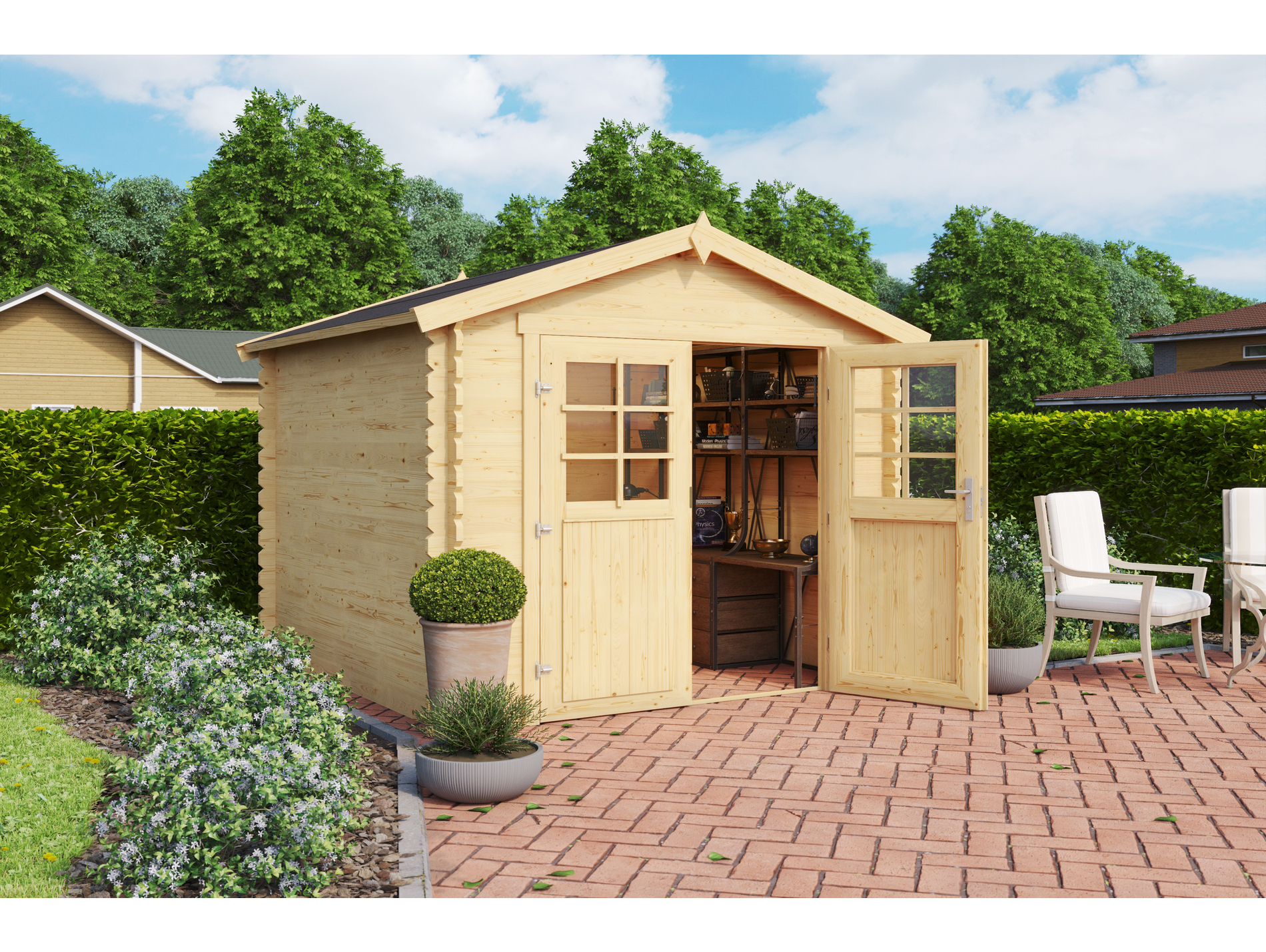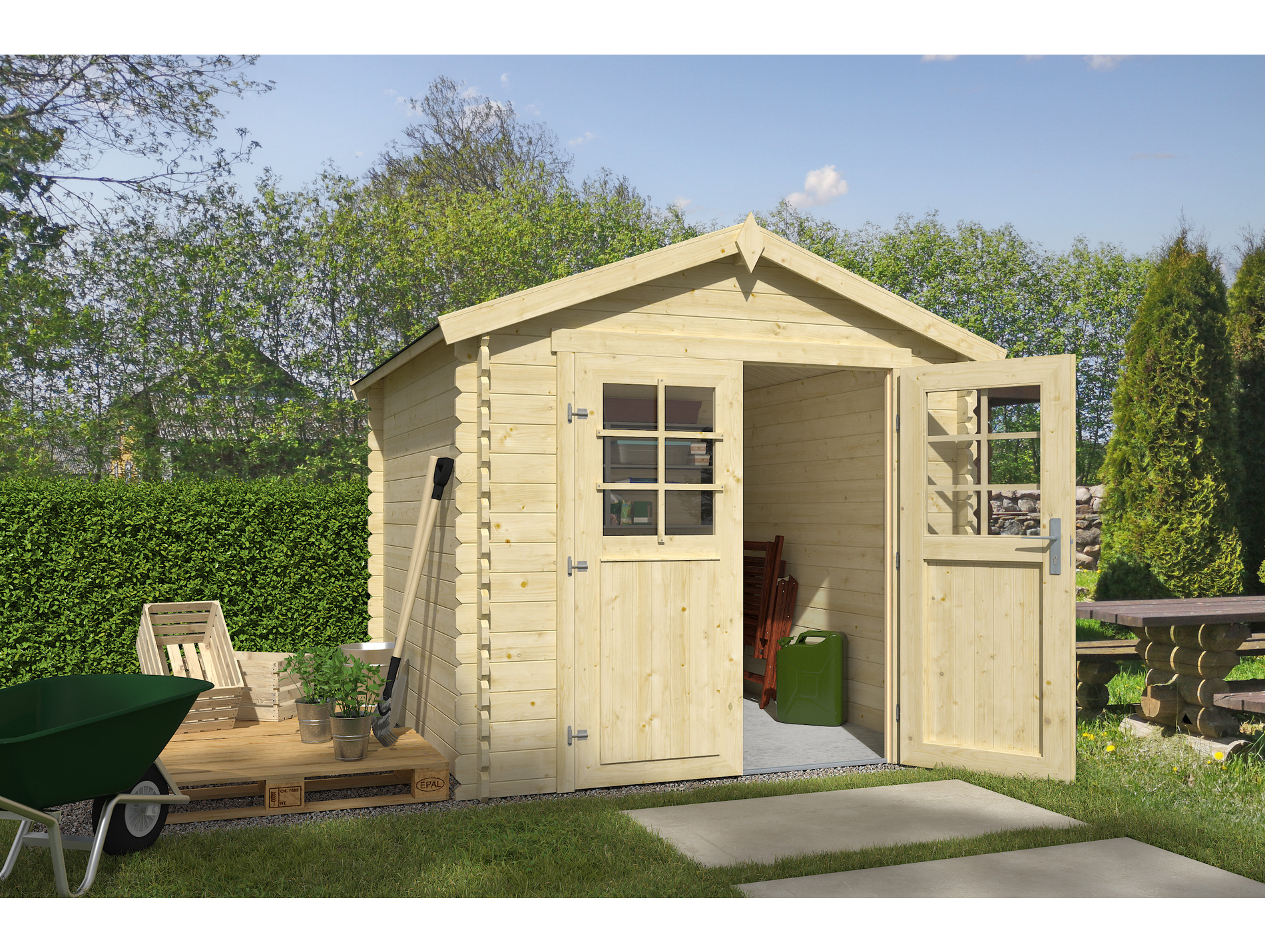 Réalisé en épicéa avec des madriers de 28 mm, cet abri s'installe par système d'emboîtement classique. Son format compact permet une intégration plus facile dans les petits jardins sans négliger l'aspect pratique.