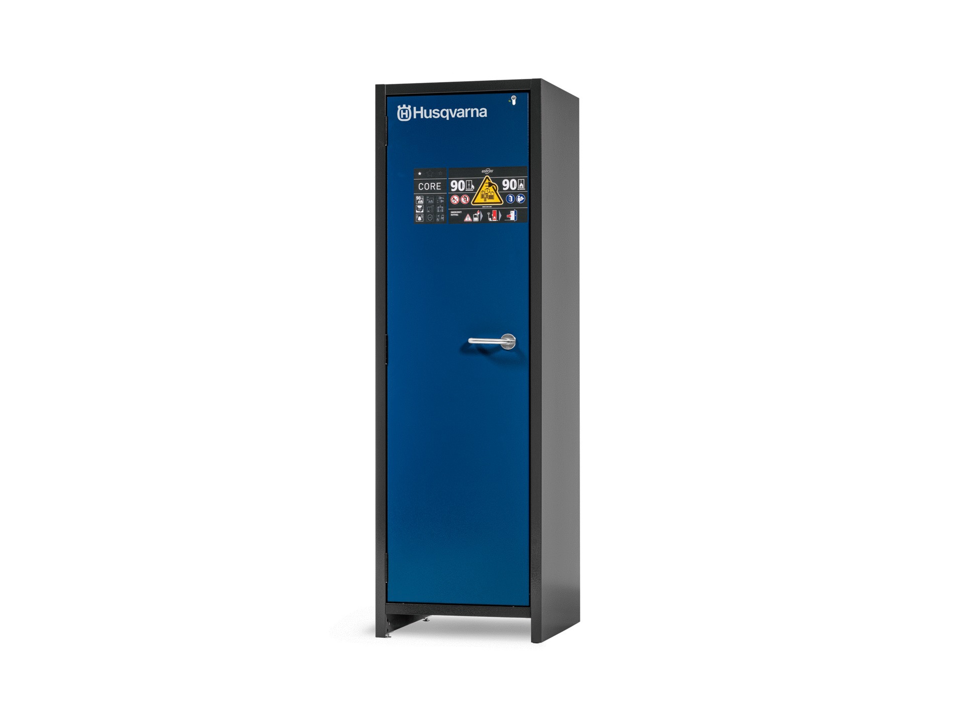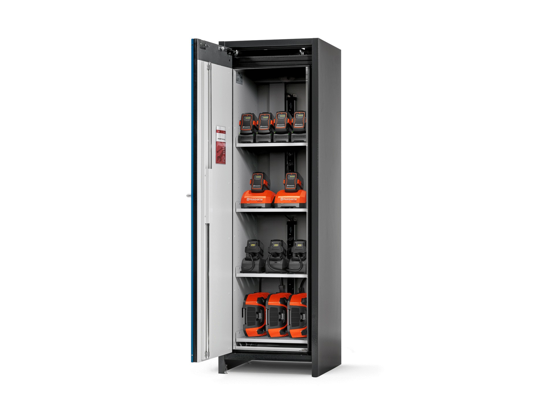 L'armoire de chargement de batteries Husqvarna M, 230V, permet un stockage sûr et une charge efficace des batteries lithium-ion. Elle est équipée d'un détecteur de fumée et d'un système d'alarme sans potentiel, avec une résistance au feu de 90 minutes. Les prises et étagères incluses assurent un rangement pratique et accessible.