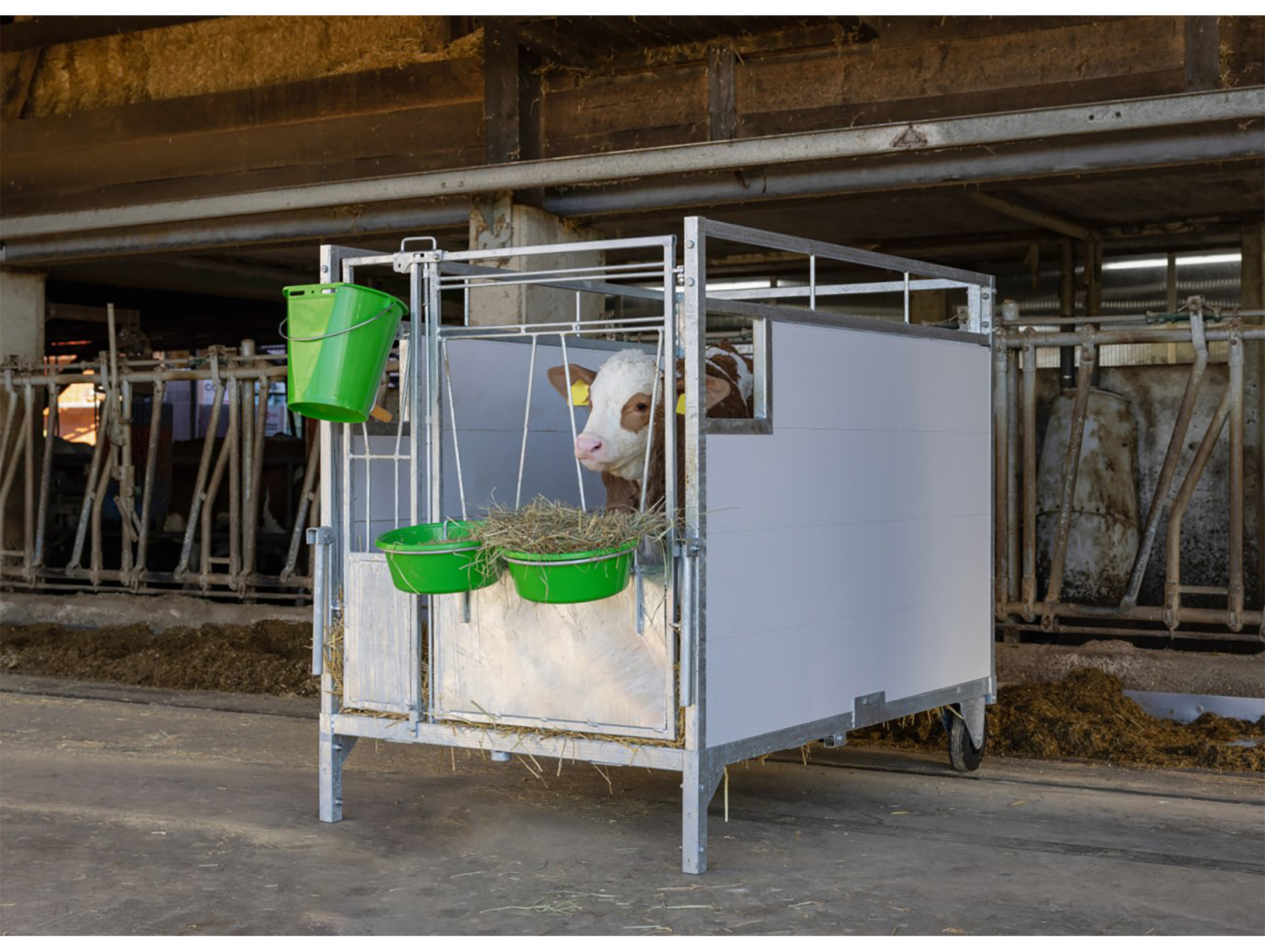 Le cadre métallique, stable et galvanisé à chaud, garantit robustesse et durabilité. Les parois latérales sont fabriquées en panneaux PVC lisses, faciles à nettoyer, et un entrebâillement dans la zone des parois permet au veau de garder un contact visuel avec ses congénères, favorisant un environnement social stimulant.