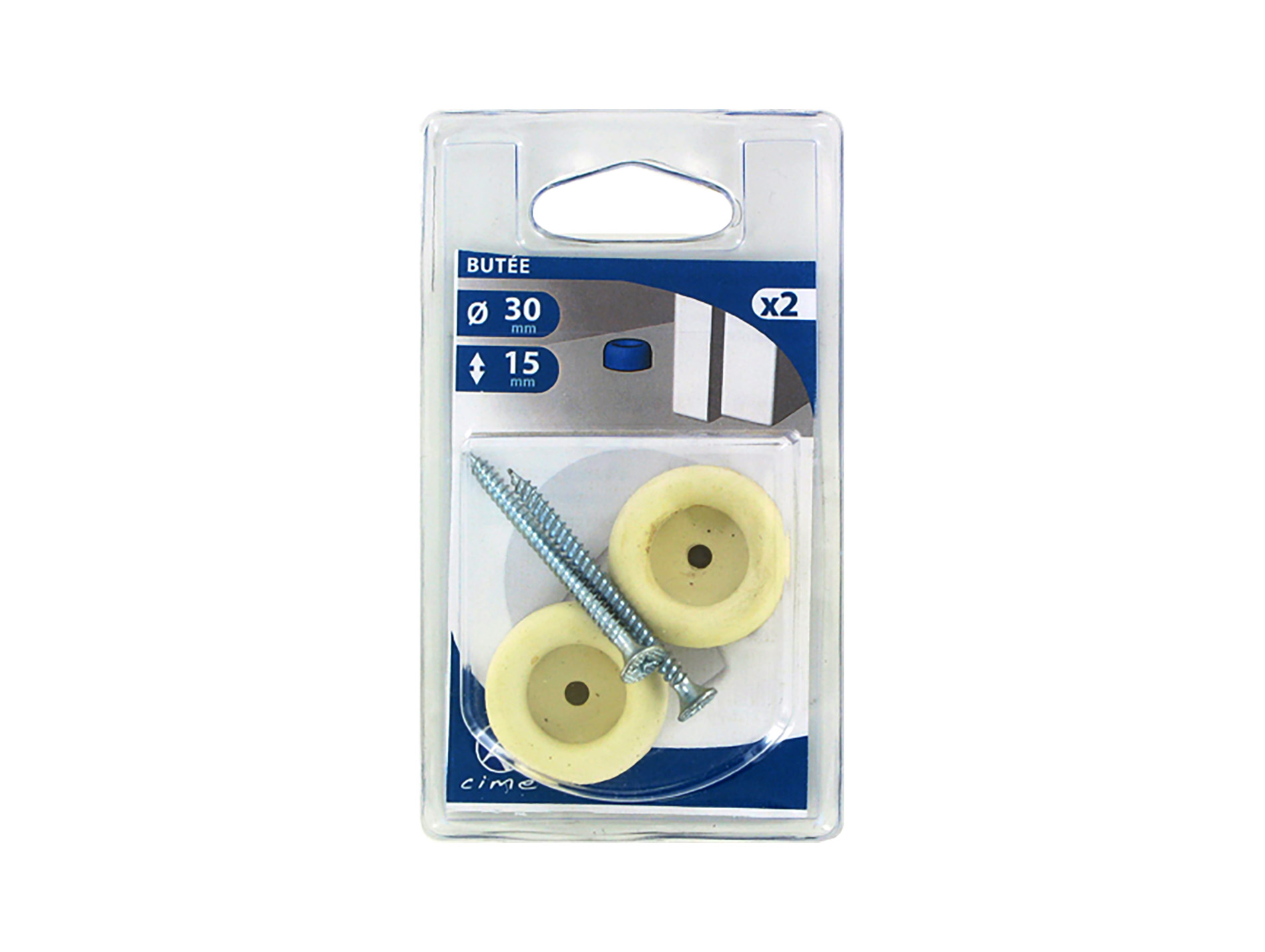 Butée de porte modèle simple pour usages divers CIME. Amortisseurs de choc et de vibrations. A visser au sol. Diamètre 30 mm x hauteur 15 mm. Avec vis à bois tête ronde cruciforme 5 x 40 mm. Matière caoutchouc blanc. Lot de 2 pièces.