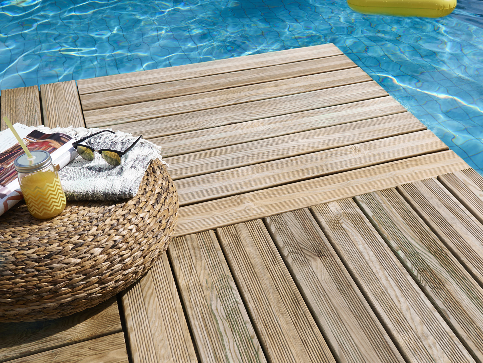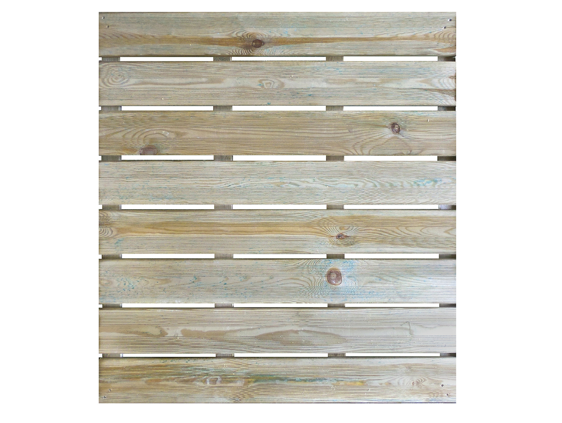 Caillebotis bois Julia pour terrasse. Dimensions : 100 x 100 cm. Epaisseur : 35 mm. En pin sylvestre traité autoclave vert. Classe 4.