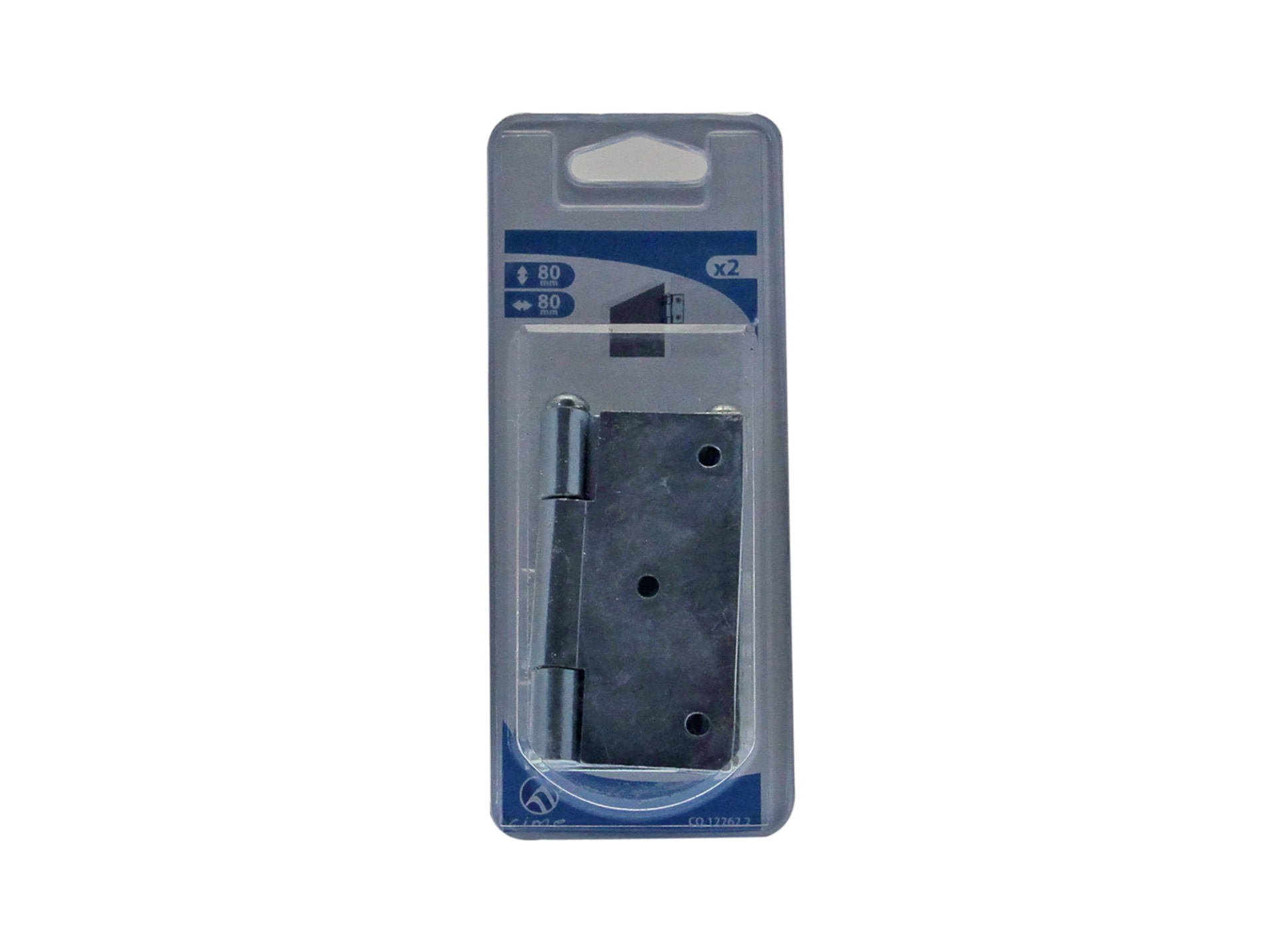 Lot de 2 charnières carrées dégondables, axe mobile CIME. Simple feuille. Hauteur : 80 mm. Largeur : 80 mm. Épaisseur : 2,5 mm. Acier zingué.