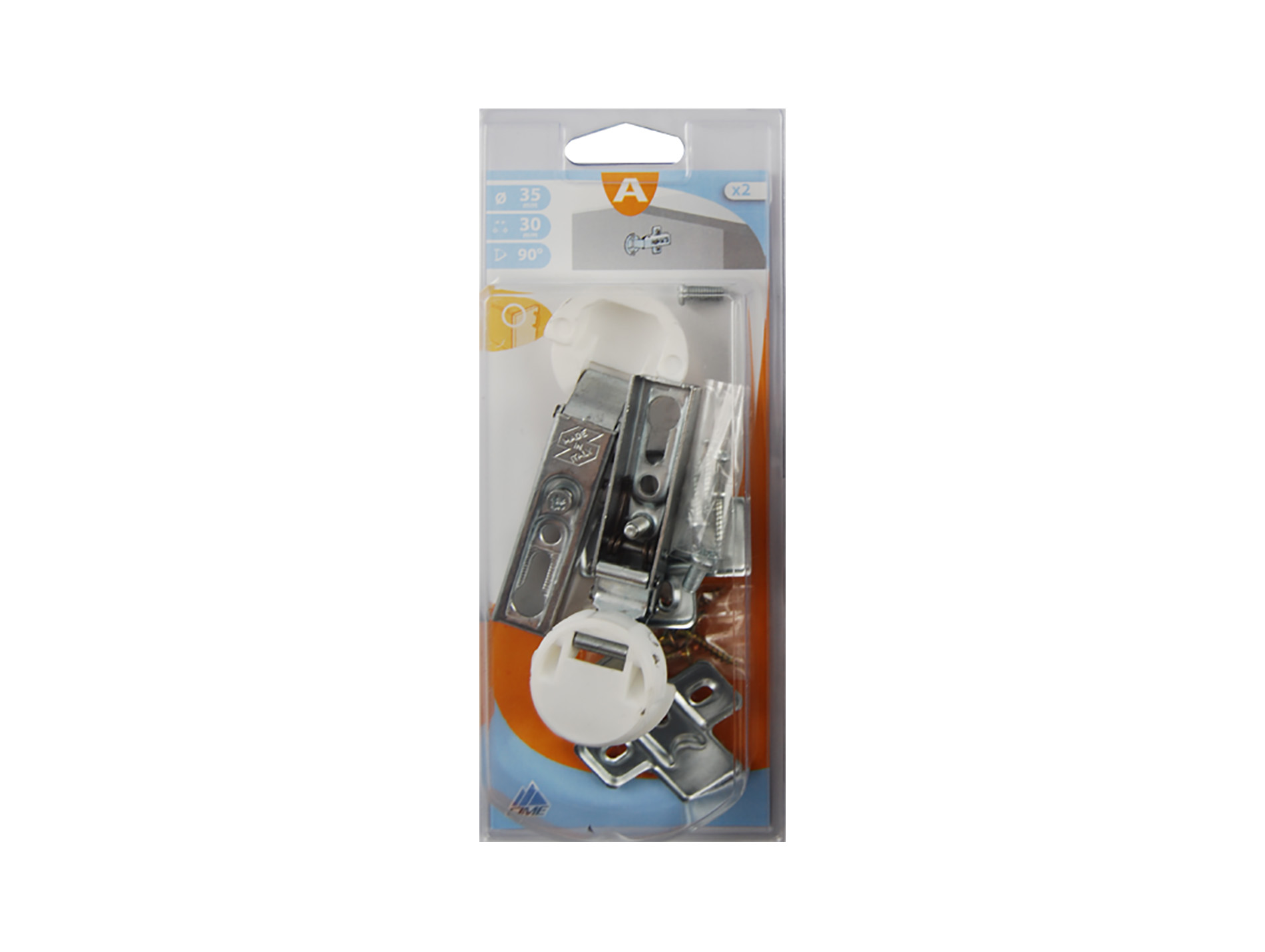 Lot de 2 charnières invisibles en applique à ressort, ouverture 90° CIME. Type de porte : recouvrement. Longueur : 105 mm. Entraxe : E28. Acier nickelé.