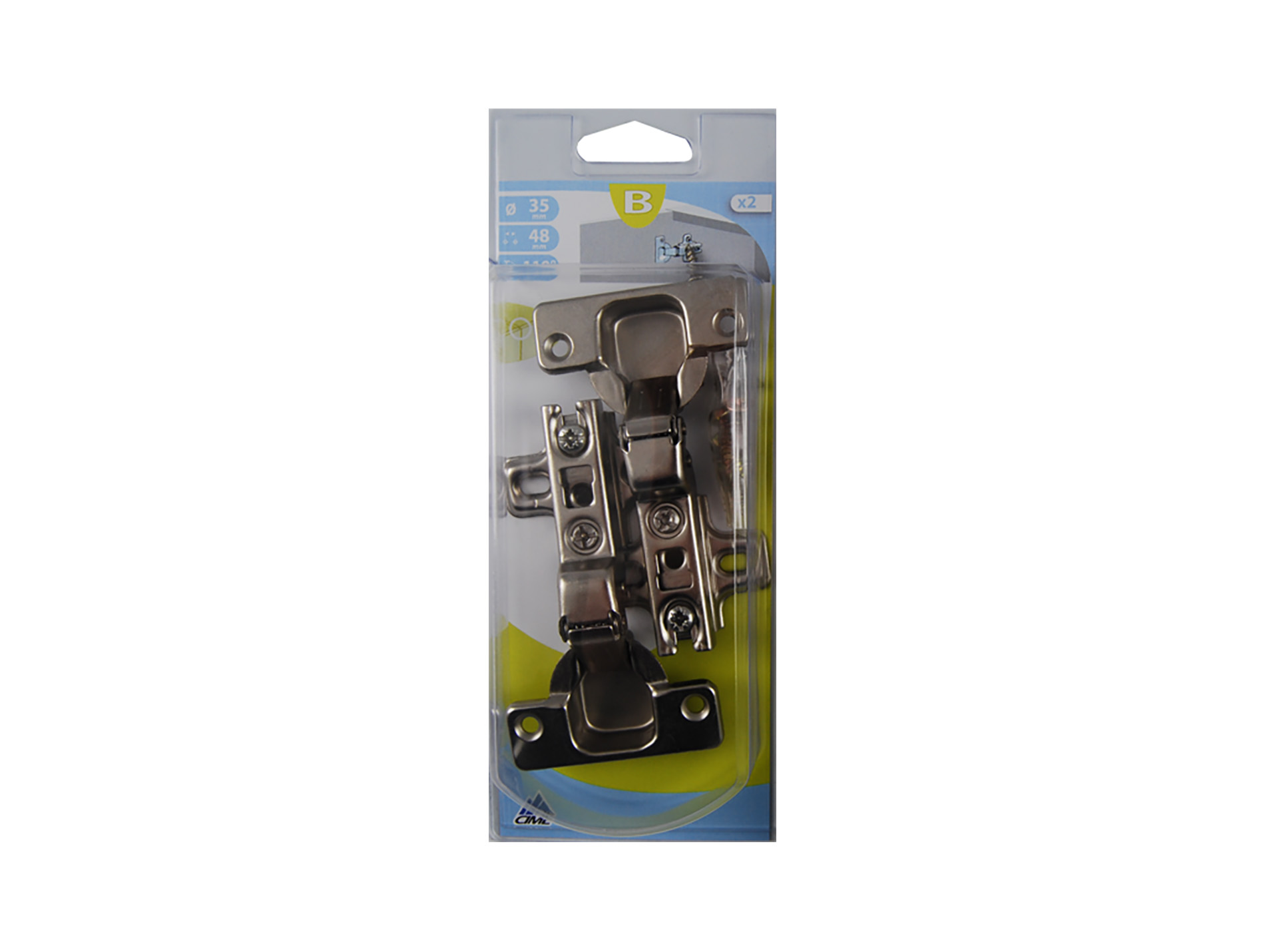 Lot de 2 charnières invisibles à boitier "Slide On" à ressort CIME. Boitier entraxe 48 mm. Type de porte : demi-recouvrement. Ouverture : 110°. Diamètre : 35 mm. Matière : acier nickelé.