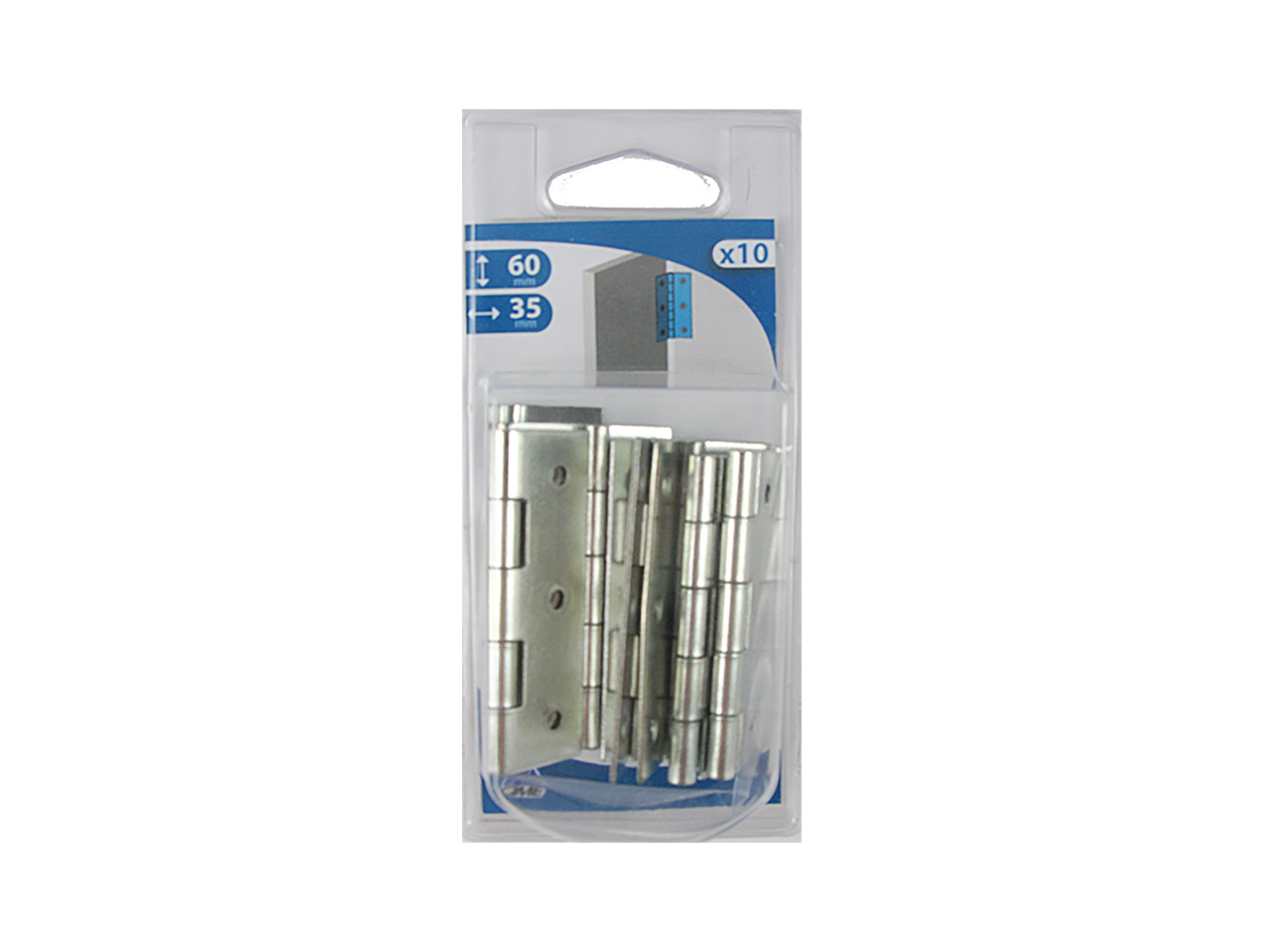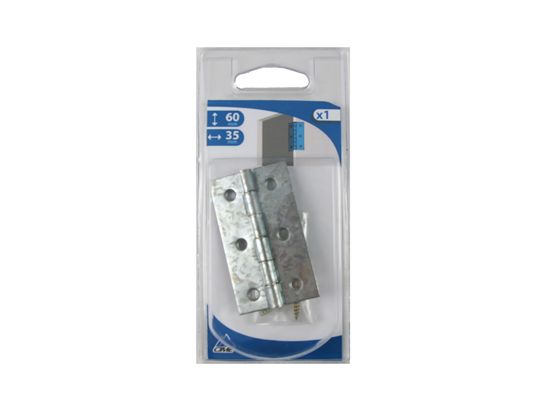 Charnière rectangulaire en acier zingué CIME. Hauteur : 60 mm. Largeur : 35 mm. Feuille simple.