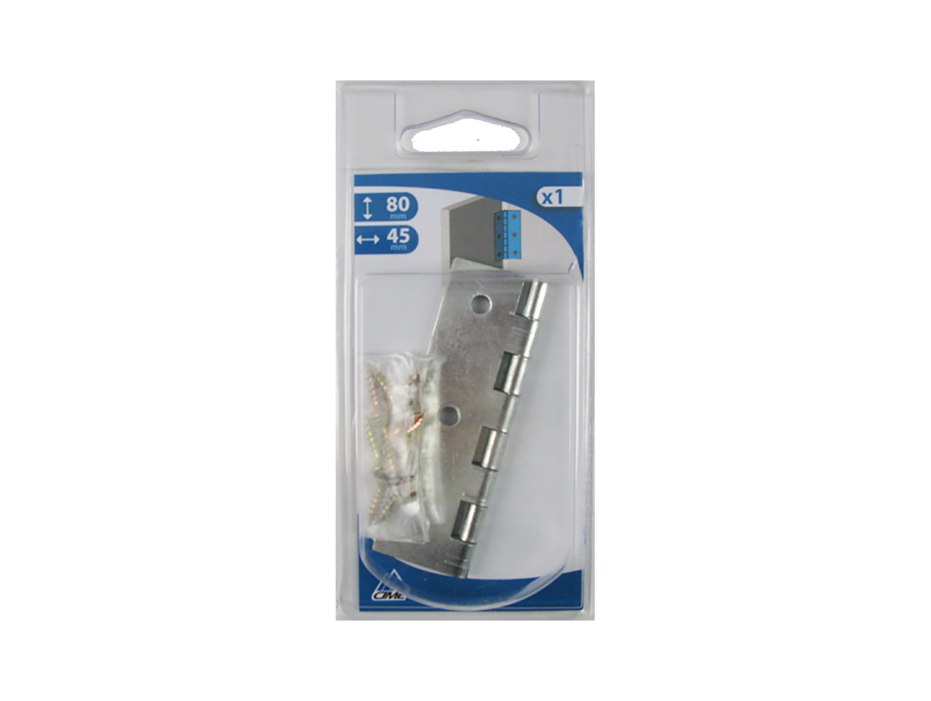 Charnière rectangulaire en acier zingué CIME. Hauteur : 80 mm. Largeur : 45 mm. Feuille simple.
