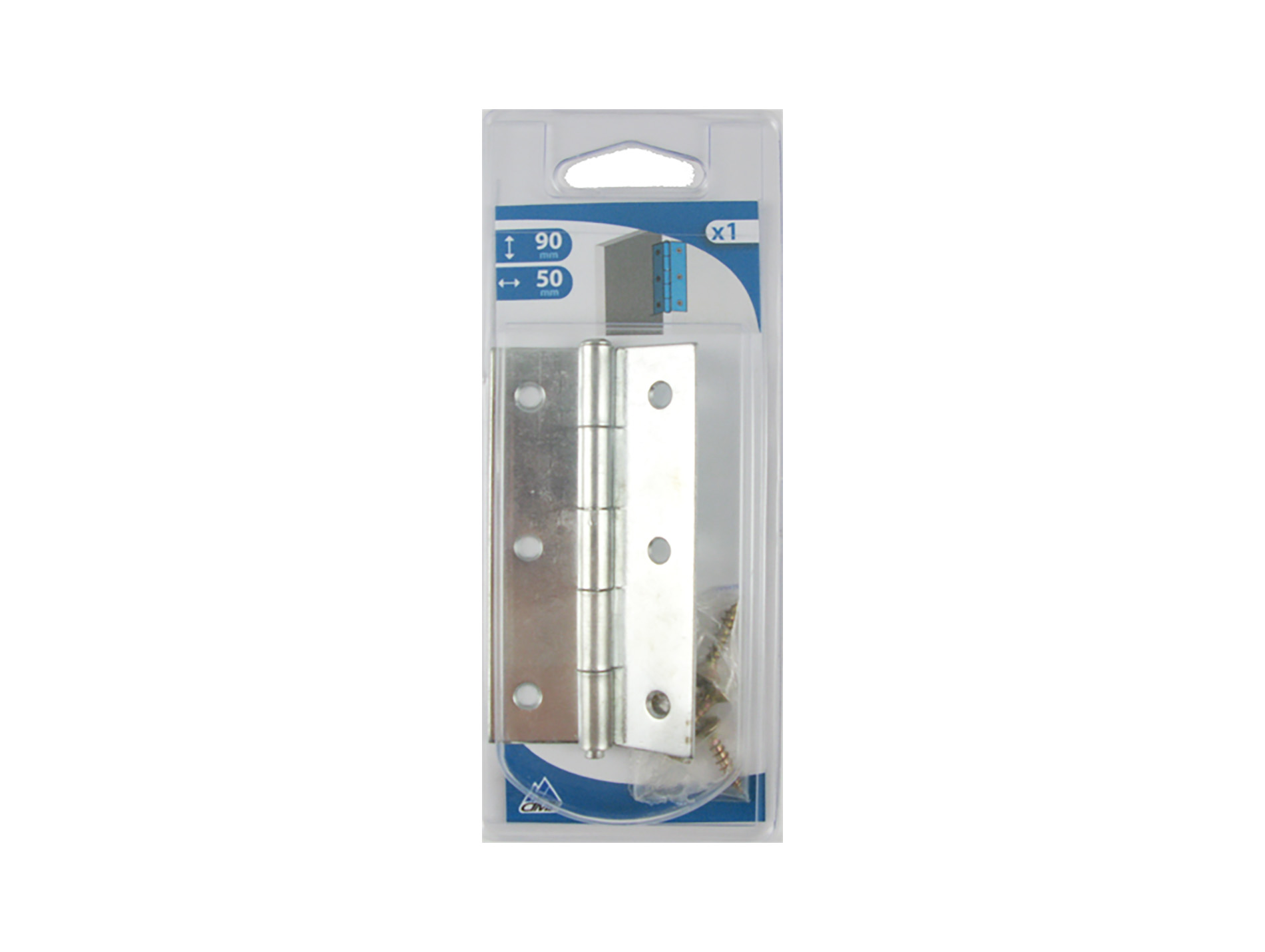 Charnière rectangulaire en acier zingué CIME. Hauteur : 90 mm. Largeur : 50 mm. Feuille simple.