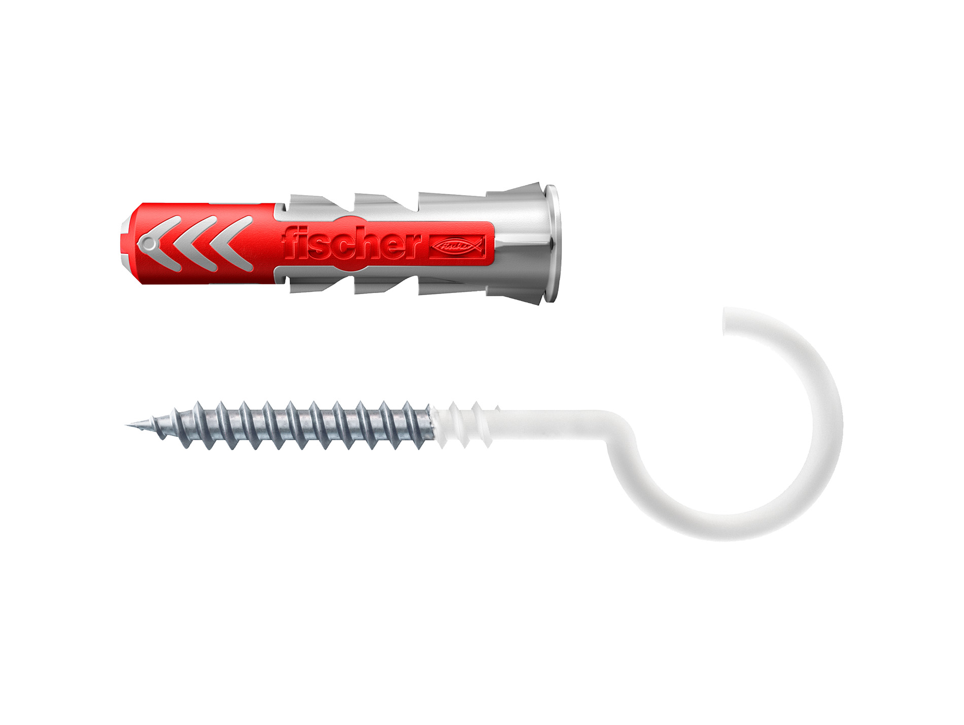 Cheville bimatière Duopower diamètre 10, longueur 50 mm avec crochet rond enduit nylon. Sachet de 2 pièces. La cheville Fischer DUOPOWER est une cheville intelligente bi-matière dotée de trois fonctions. La cheville DUOPOWER convient à la fixation dans tous les matériaux de construction. Cela permet une variété d'applications avec une seule cheville. La cheville Fischer DUOPOWER s?adapte automatiquement au matériau de construction et permet des charges élevées grâce aux trois principes de fonctionnement du produit : s'expanse, se déploie, forme un noeud. Pour fixer supports TV, lampes, étagères murales, cadres, stores enrouleurs, chauffages et sanitaires, équipements de salle de bain, etc. La longueur requise de la vis se détermine comme suit : longueur de la cheville + épaisseur à fixer + diamètre de la vis.