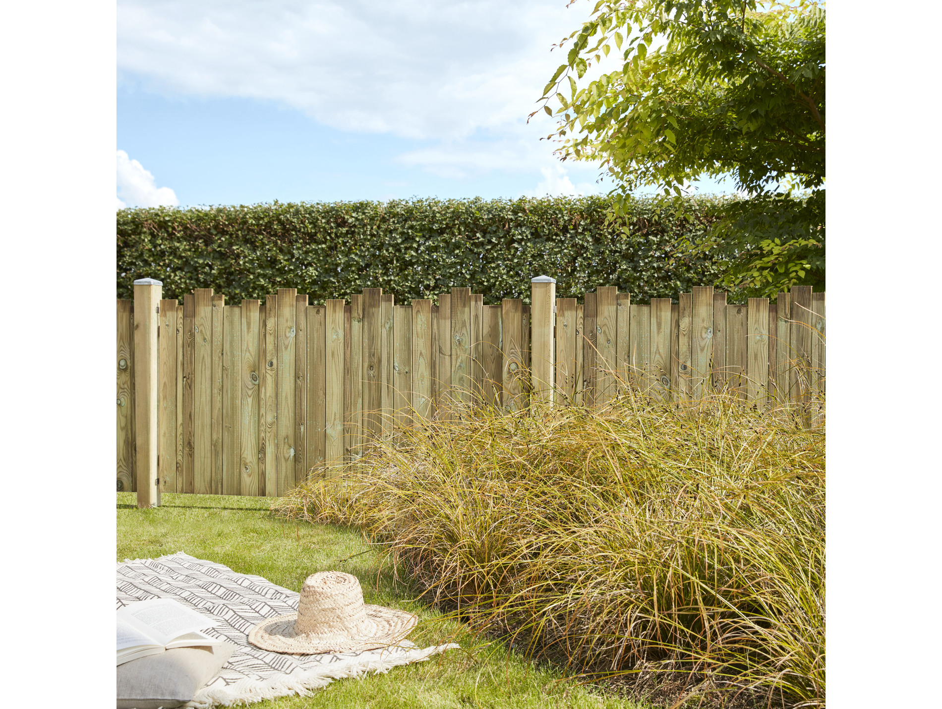 Réalisée en pin sylvestre, elle s'intègre naturellement dans l'environnement extérieur. Son format L.1800 x h.950 mm facilite la mise en place de plusieurs panneaux pour créer une clôture homogène et esthétique.