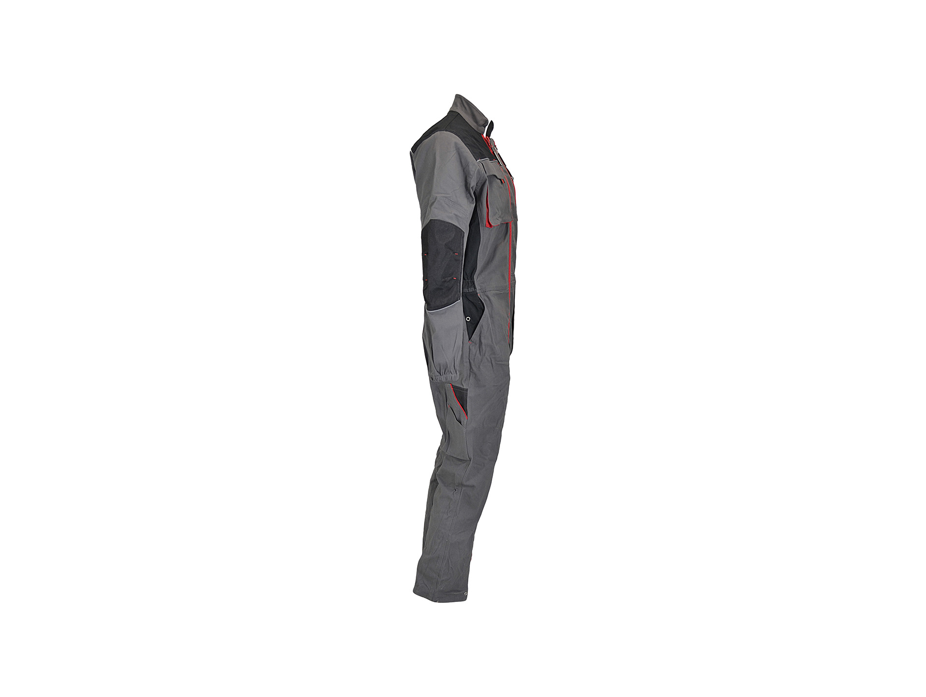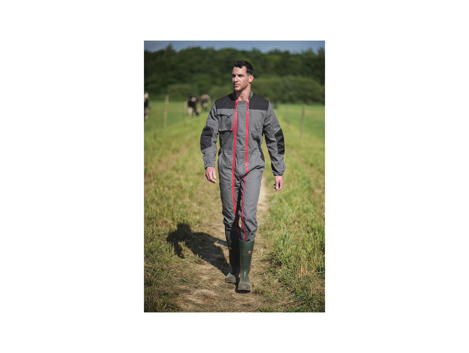 Combinaison Extra avec double fermeture extensible et de multiples poches. Elle est équipée de renforts aux coudes en oxford, d'une ceinture et de poignets plastiqués, de détails rétro-réfléchissants devant et dans le dos.