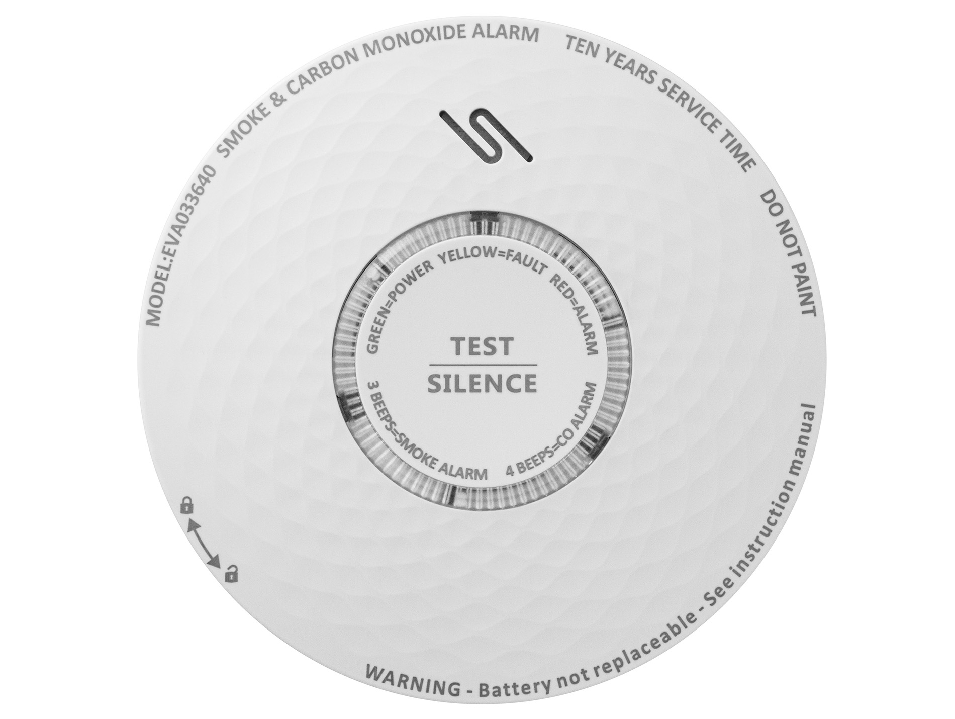 Détecteur 2 en 1 : fumée et monoxyde, avec une zone de détection de 20 à 40 m². Bouton test/pause. Avec pile non remplaçable. Norme CE.