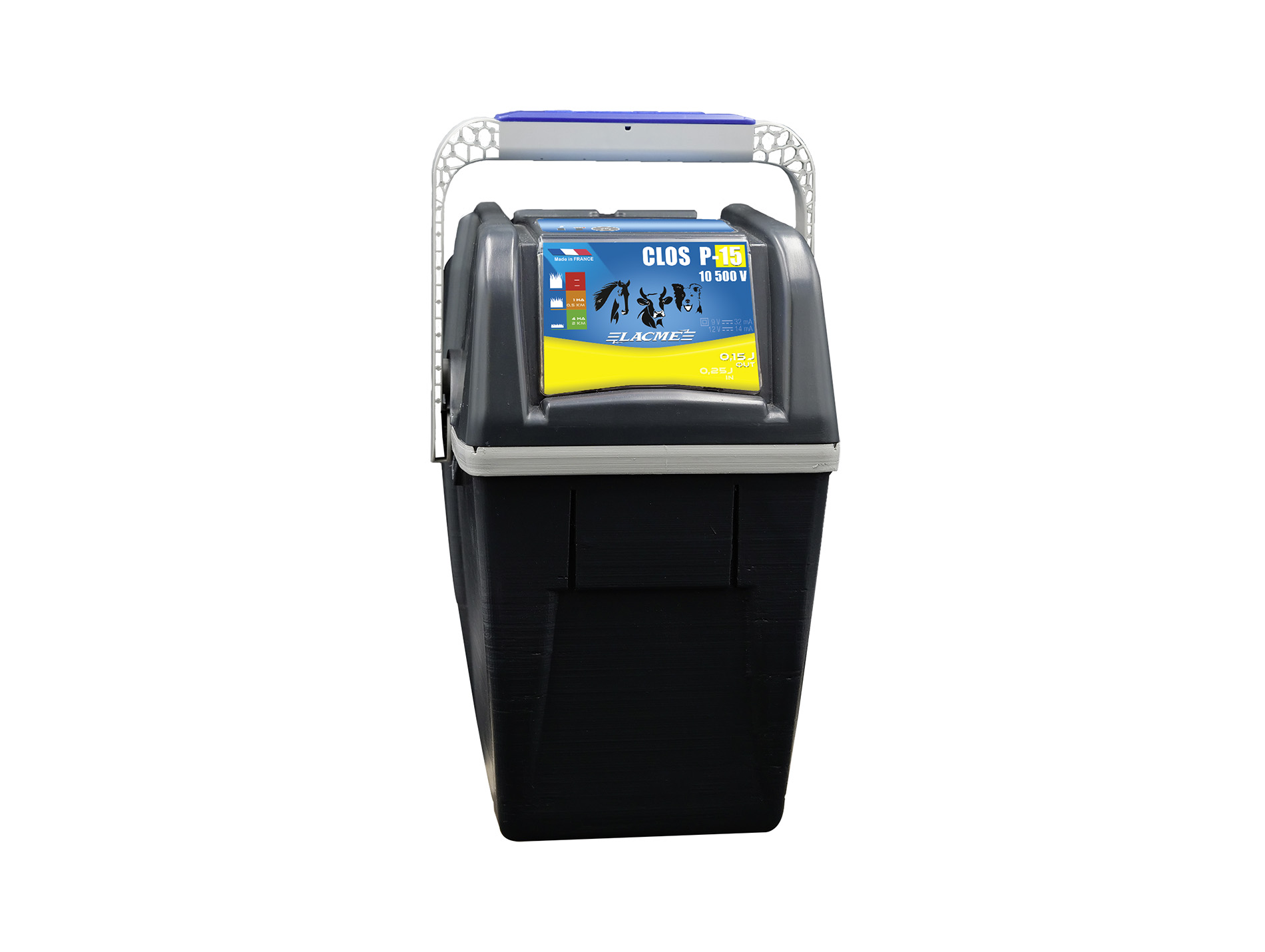 Electrificateur Clos P15 de LACME est conçu pour les petits enclos et les clôtures mobiles. Avec une tension de 10 500 volts et une énergie de 0,15 joule, il offre une protection efficace pour contenir les animaux. Doté d'un bouton marche-arrêt et de LED indicatrices de fonctionnement et de niveau de batterie, il est facile à utiliser et offre une grande praticité.