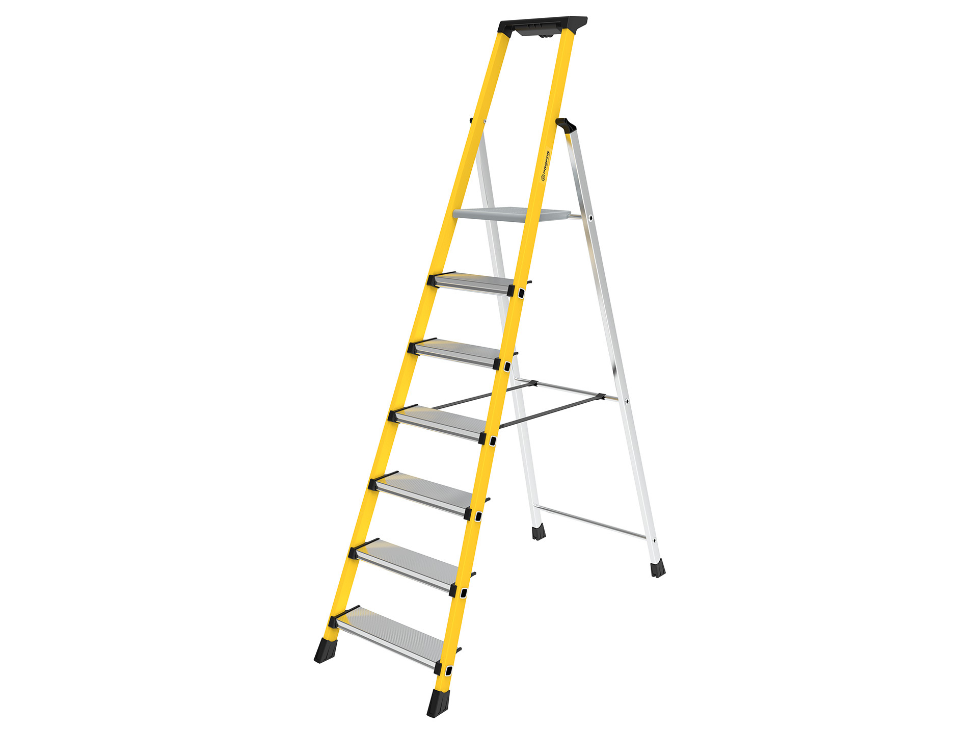 Escabeau 7 marches à usage professionnel, ultra léger en aluminium, robuste et stable avec une largeur de marche de 11 cm. Articulations en fonderie d'aluminium, nervurées, avec patins anti-usure intégrés. Fixation des marches par sertissage professionnel. Confortable avec son repose pieds XL de 28 x 27,5 cm. Pratique, il est doté d'un porte outils multifonction (logements visserie et perceuse, crochet porte seau).