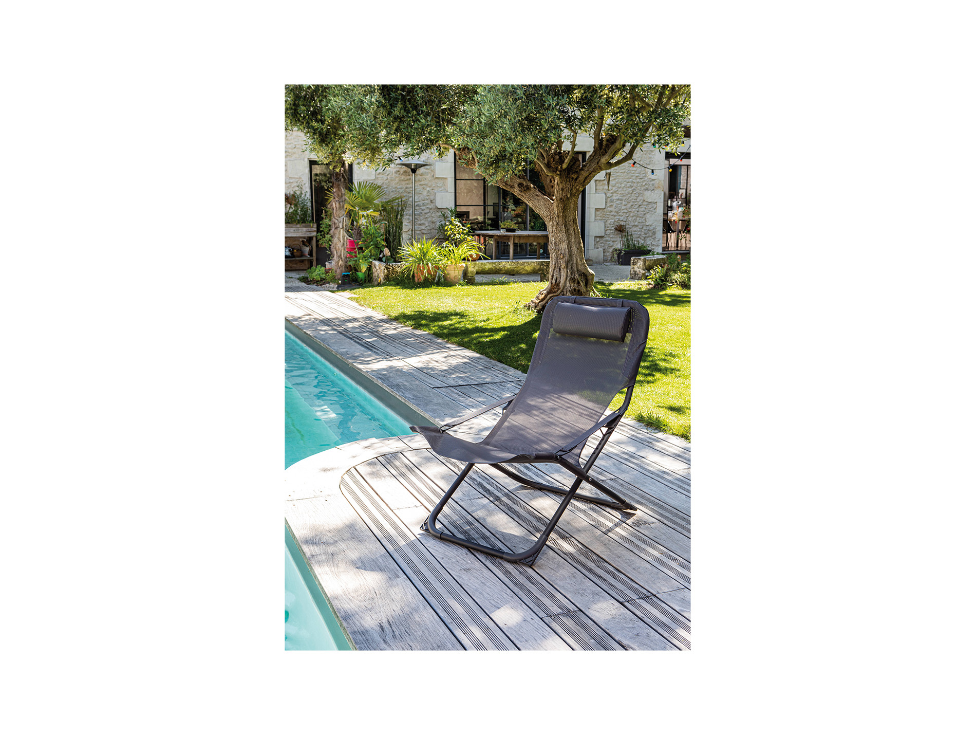 Sa toile tendue TPEP offre un confort souple et agréable, tout en laissant circuler l'air et en séchant rapidement. Le dossier réglable permet d'adapter la position selon vos envies, tandis que la têtière améliore le confort lors des temps de repos.