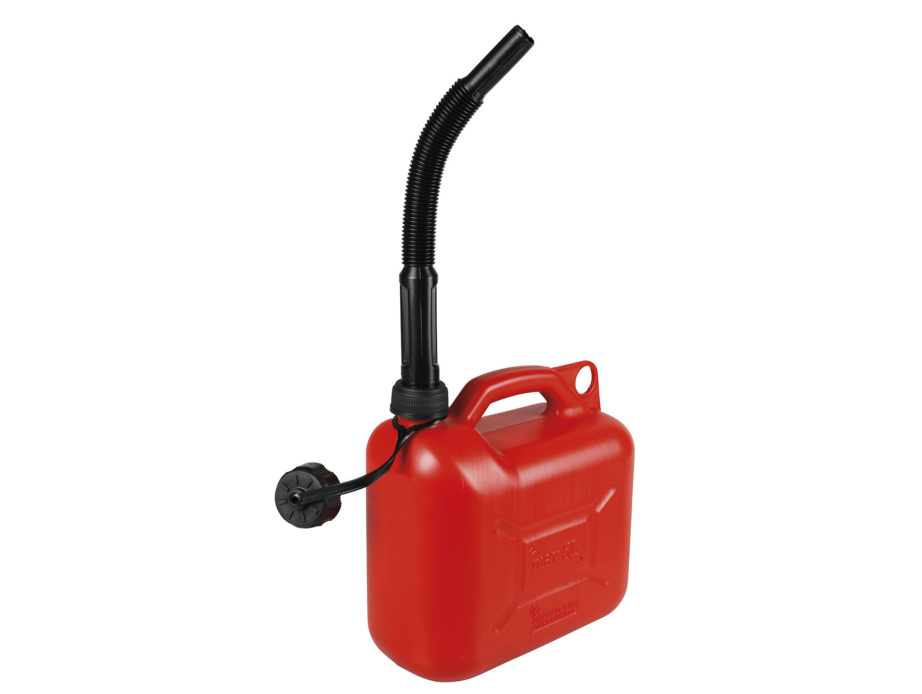 Jerrican en plastique d'une contenance de 5 litres. Homologué pour le transport de matériaux inflammables comme l'essence ou le gazole avec une fermeture par bouchon à griffe à verrouillage rapide. Livré avec bec verseur. Coloris : rouge.
