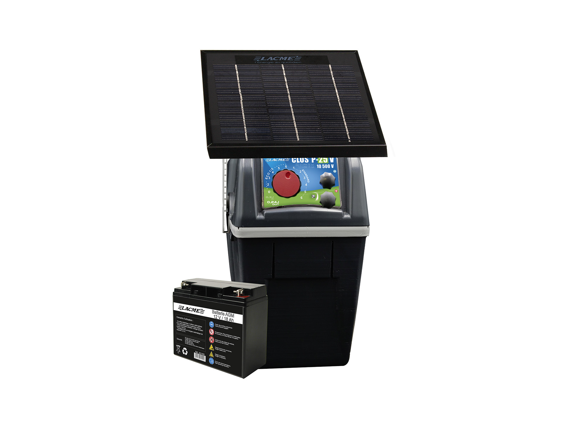 Kit solaire complet Clos P25 de LACME est une solution autonome idéale pour les clôtures mobiles. Il comprend un électrificateur d'une puissance de 0,24 joule et d'une tension de 10 500 volts, ainsi qu'un panneau solaire de 3 watts et une batterie de 18 Ah. Ce kit offre une excellente combinaison entre puissance et autonomie, parfaitement adaptée aux besoins des utilisateurs.