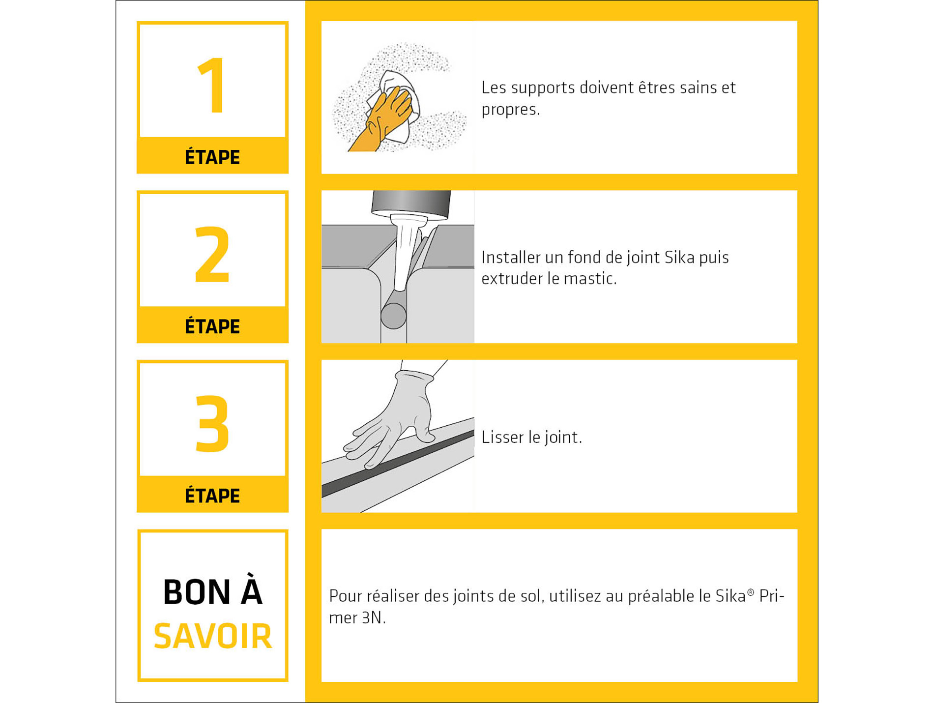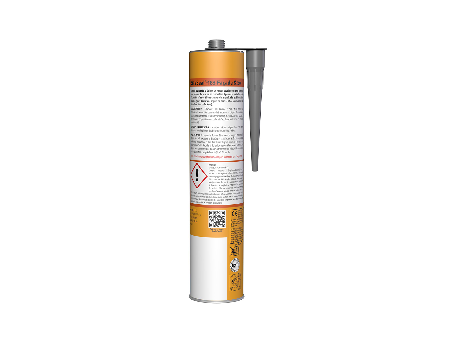 Le mastic polyuréthane SikaSeal®-183 Façade & Sol de Sika est un produit mono composant élastique, spécialement conçu pour réaliser des joints d'étanchéité à l'air et à l'eau de pluie dans les travaux de construction neuve et de rénovation, particulièrement adapté pour une utilisation en extérieur. Il est idéal pour les applications telles que les joints de préfabrication légère, autour des menuiseries extérieures en bois ou en aluminium, autour des gaines d'aération traversant les murs, et autour d'autres éléments du second ?uvre comme les bandes de solin, les couvre-joints, les grilles d'aération, les appuis de baie, et les éléments en terre cuite. Ce mastic est également approprié pour les joints de sol dans les zones piétonnières et à trafic léger.