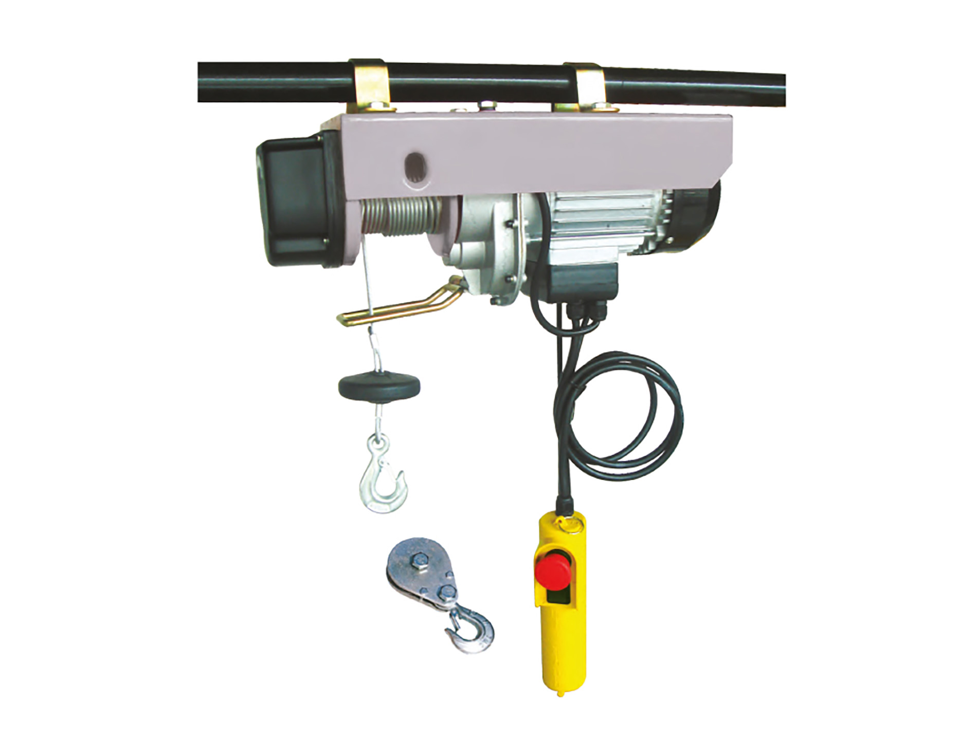 Palan électrique / treuil de 780W offrant une capacité de levage de 200 kg sans poulie et 400 kg avec poulie. Vitesse de levage de 200 kg x 8 m. Longueur de câble : 12 m. Diamètre : 3,6 mm.