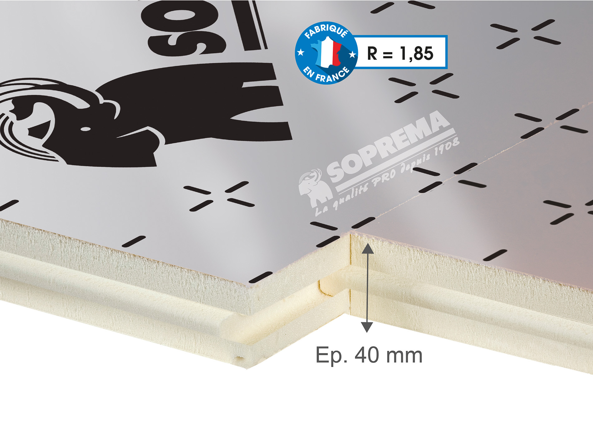 L'Isolant PU Haute Performance de SOPREMA d'épaisseur 40 mm à bords emboitables est un panneau isolant de polyuréthane- revêtu sur ses deux faces- d'un parement multicouches étanche. Un produit à très haute performance thermique destiné à l'isolation de toutes les parois opaques du logement : murs intérieurs- murs extérieurs- sols sous chape ou sous dallage en neuf ou en rénovation.