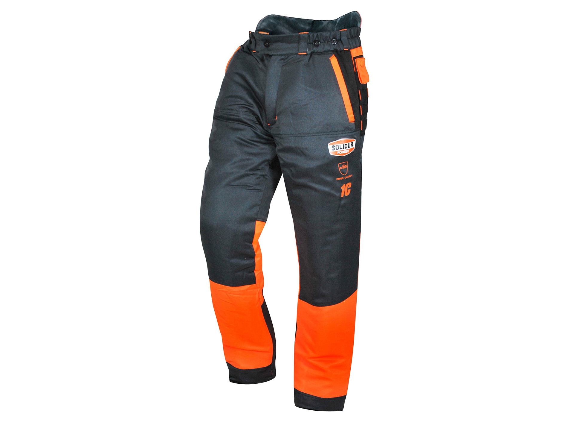 Pantalon de protection scie à chaîne SOLIDUR Authentique type A classe 3 - 28 m/s. Poids total en taille M : 1.45 kg. Protection 9 couches. Doublure polyester extensible. Réalisé en polyester 150 g/m² coloris gris et orange hydrophobe. 2 poches italiennes à l'avant. 1 poche à clé à bougie. 1 poche mètre anti retour. 1 bride porte outils. Ceinture élastiquée, boutons pour bretelles. Dos bavette enveloppante. Crochets de fixation en bas de pantalon anti-happement. ZIPSOL® pour poches adaptables. Entrejambe 78 à 86 suivant la taille.