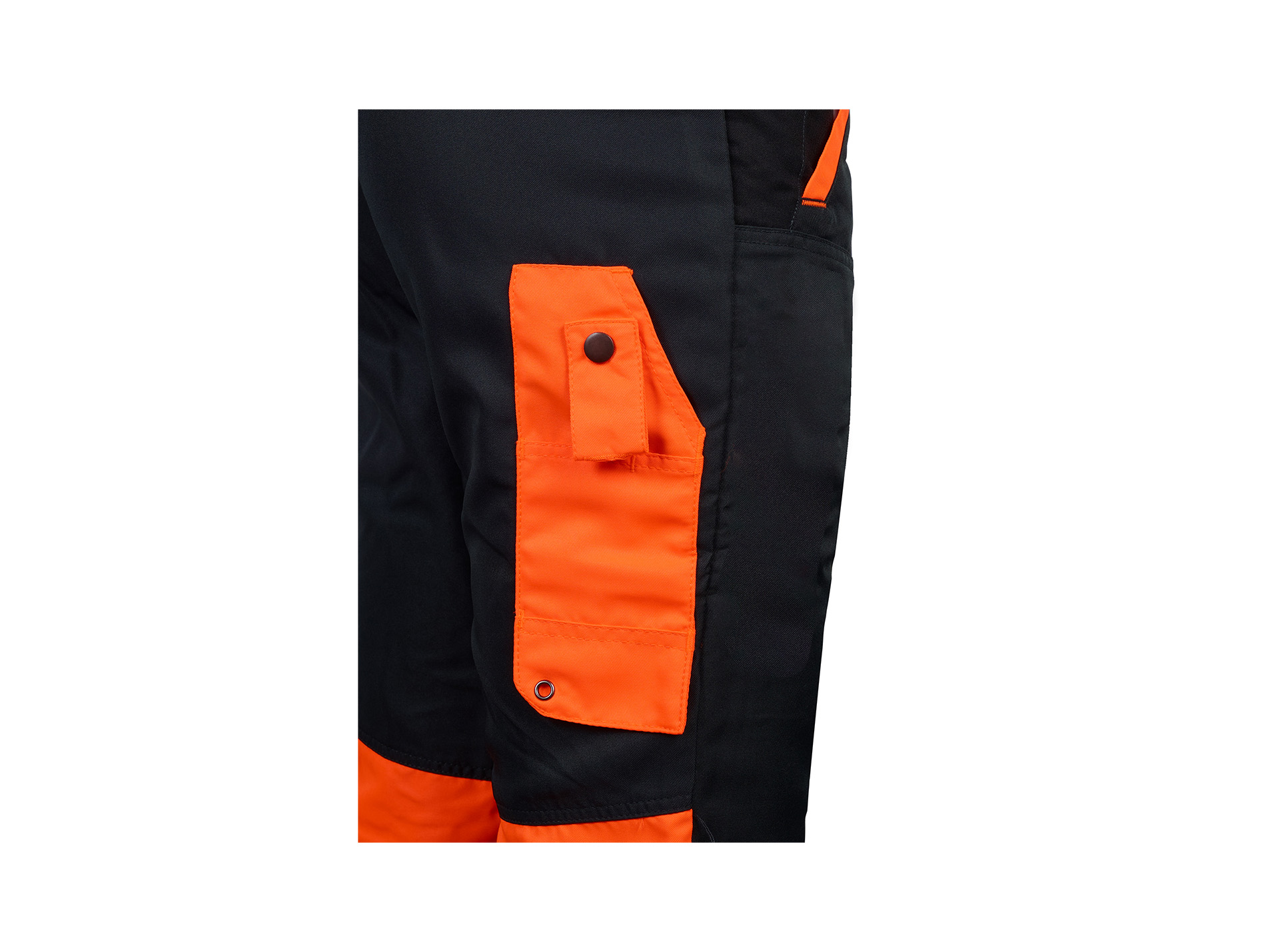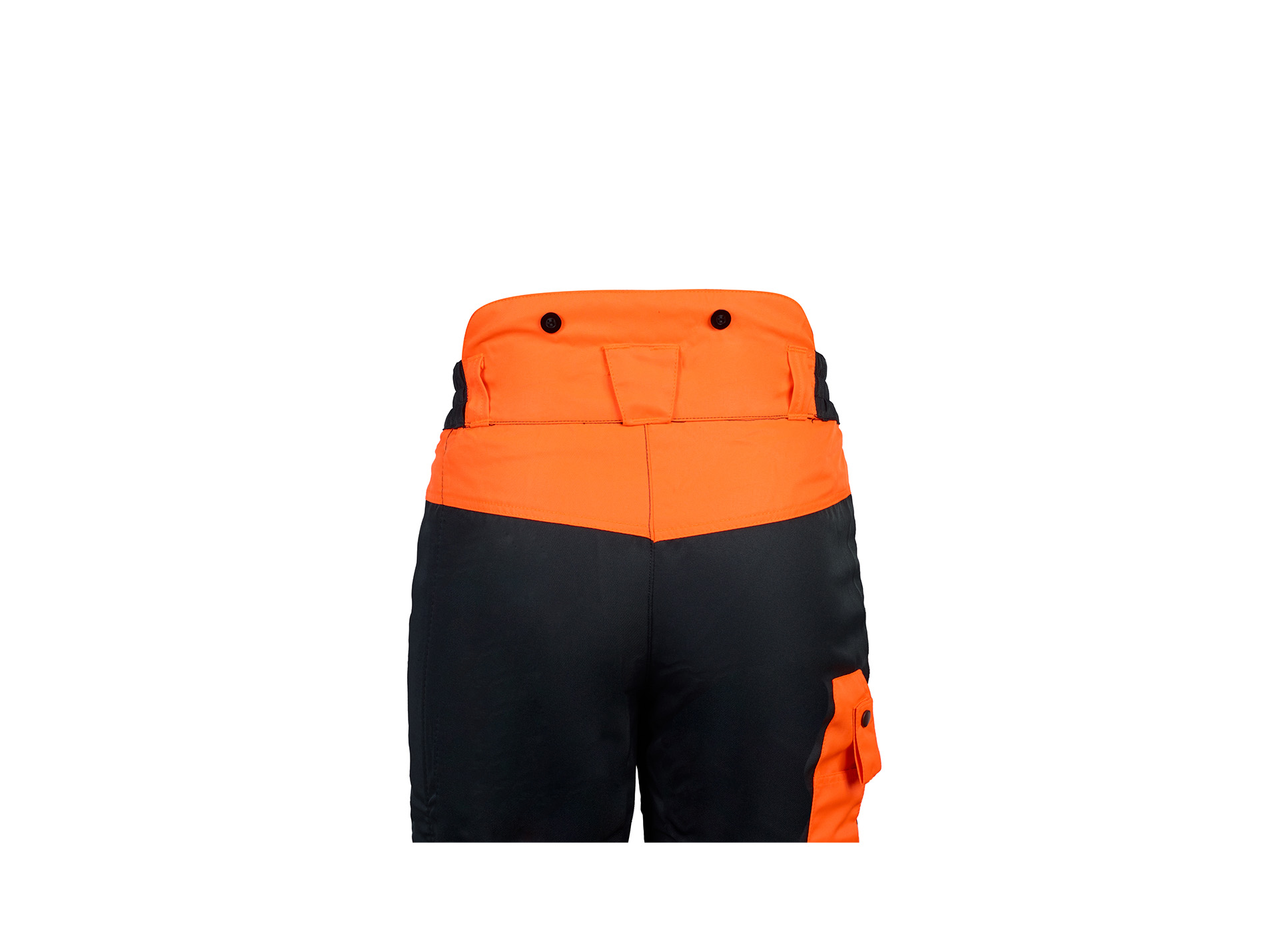 Pantalon de protection scie à chaîne SOLIDUR Authentique Protection 5 couches. Doublure polyester extensible. Réalisé en polyester 150 g/m² coloris gris et orange hydrophobe. 2 poches italiennes à l'avant. 1 poche à clé à bougie. 1 poche mètre anti retour. 1 bride porte outils. Ceinture élastiquée, boutons pour bretelles. Dos bavette enveloppante. Crochets de fixation en bas de pantalon antihappement. Entrejambe 78 à 86 suivant la taille. ZIPSOL pour poches adaptables. Poids total en taille M : 1,05 kg.