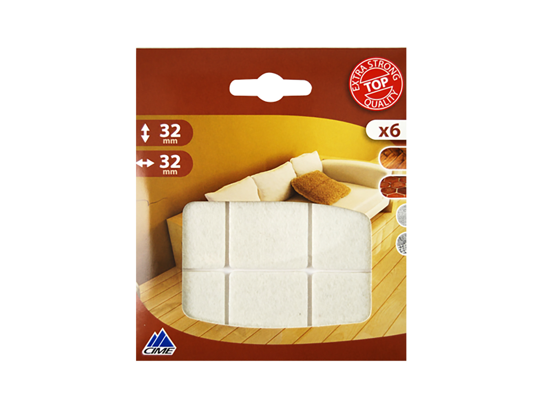 Patin carré à coller CIME. Longueur : 32 mm. Largeur : 32 mm. Feutre blanc. Par 6.