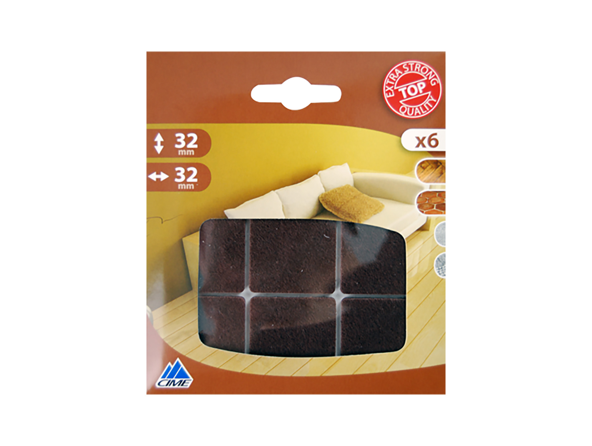 Patin carré à coller CIME. Longueur : 32 mm. Largeur : 32 mm. Feutre brun. Par 6.