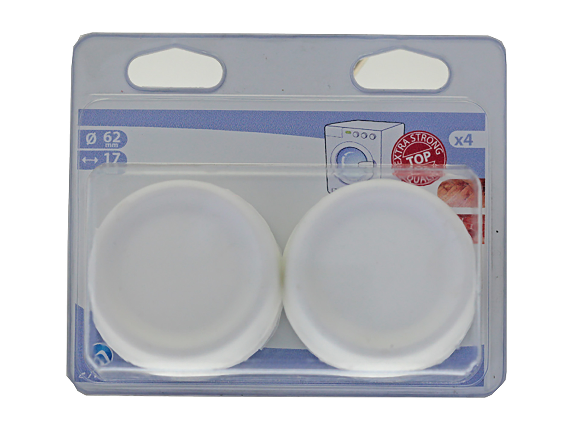 Patin rond antivibration CIME pour machine à laver. Hauteur : 17 mm. Diamètre : 62 mm. Plastique blanc. Par 4.