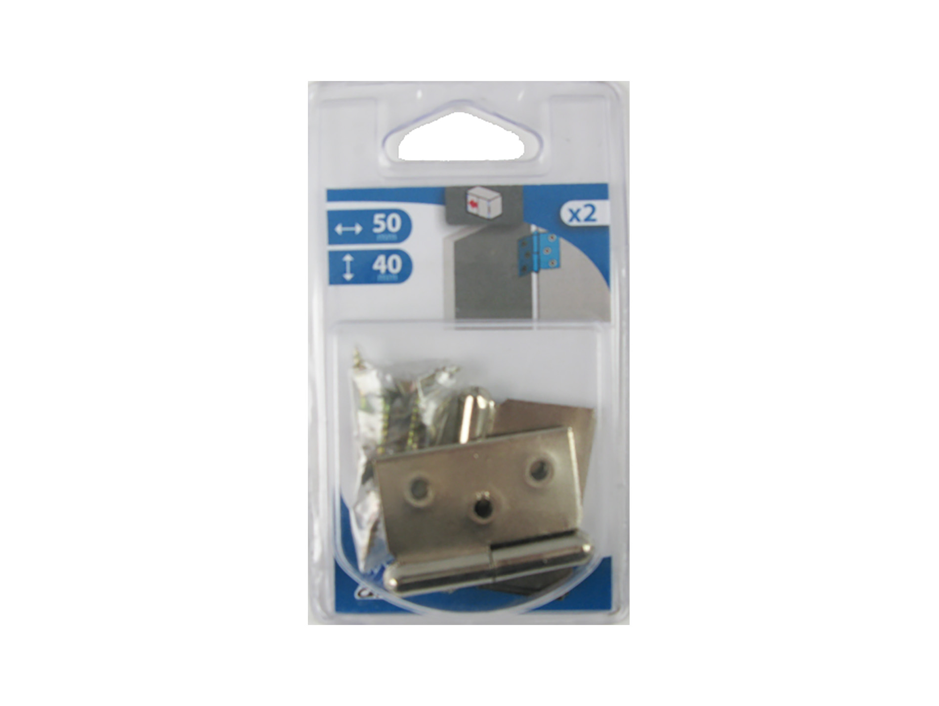 Lot de 2 paumelles à bouchon CIME, pour porte gauche. Hauteur : 40 mm. Largueur : 50 mm. Acier nickelé.