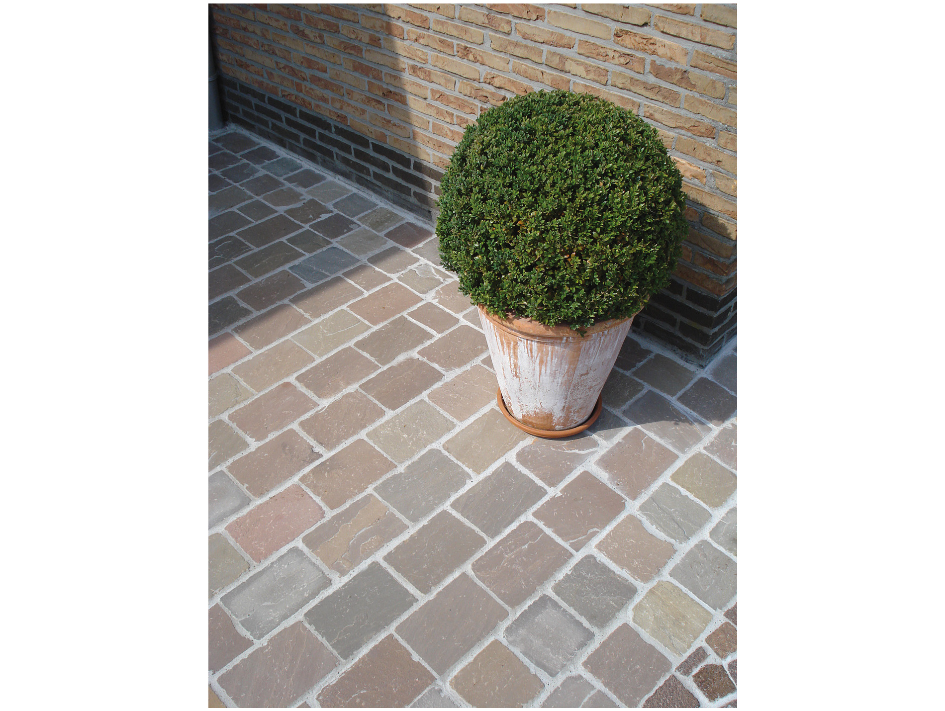 Pavé carrossable Kandla Mix en pierre naturelle. Dimensions : 14 x 14 cm. Epaisseur : 5,7 cm.