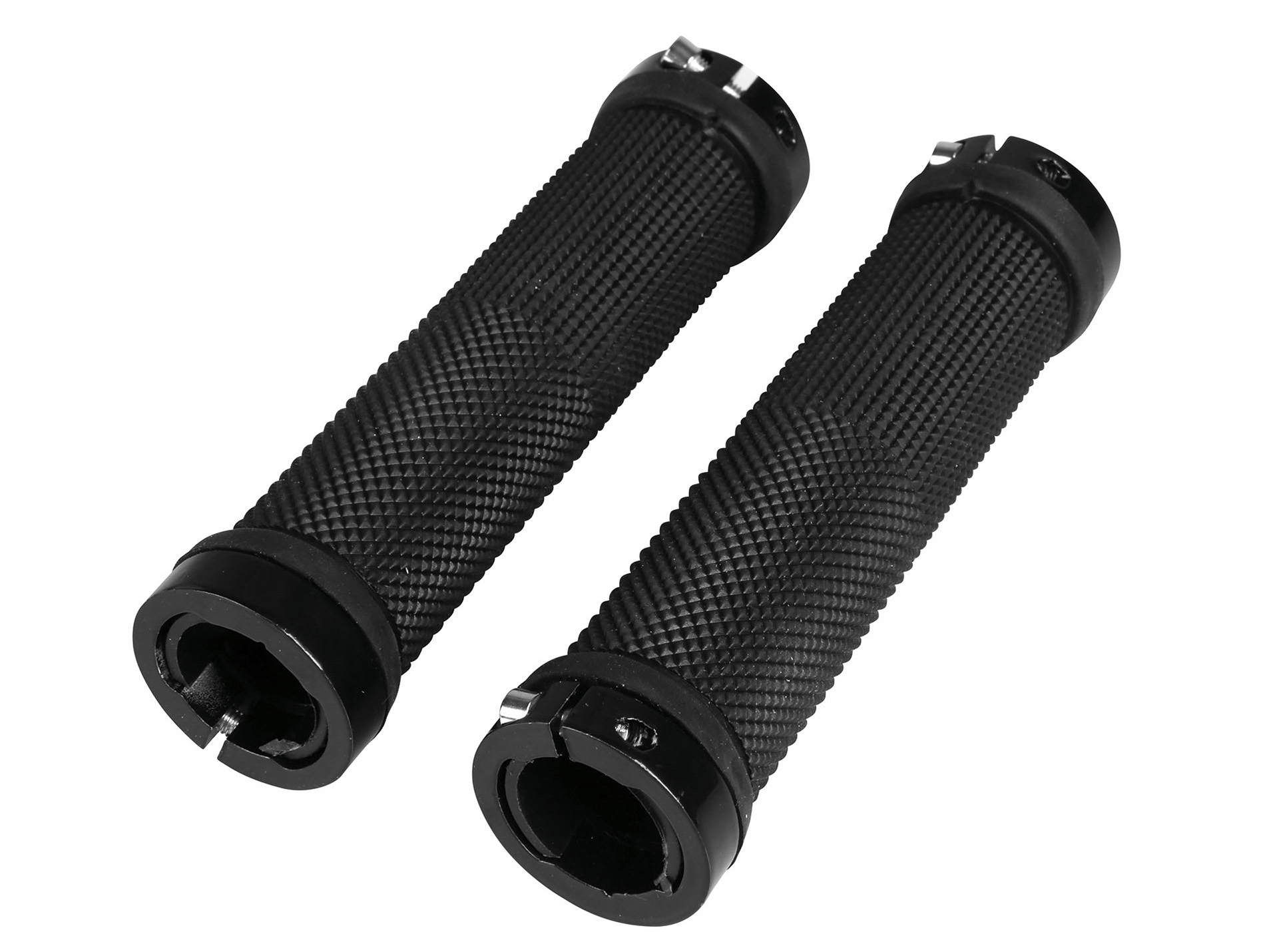 Paire de poignées de vélo. Anti-adhérentes, elles disposent d'une bague métal et offrent un meilleur maintien du guidon.