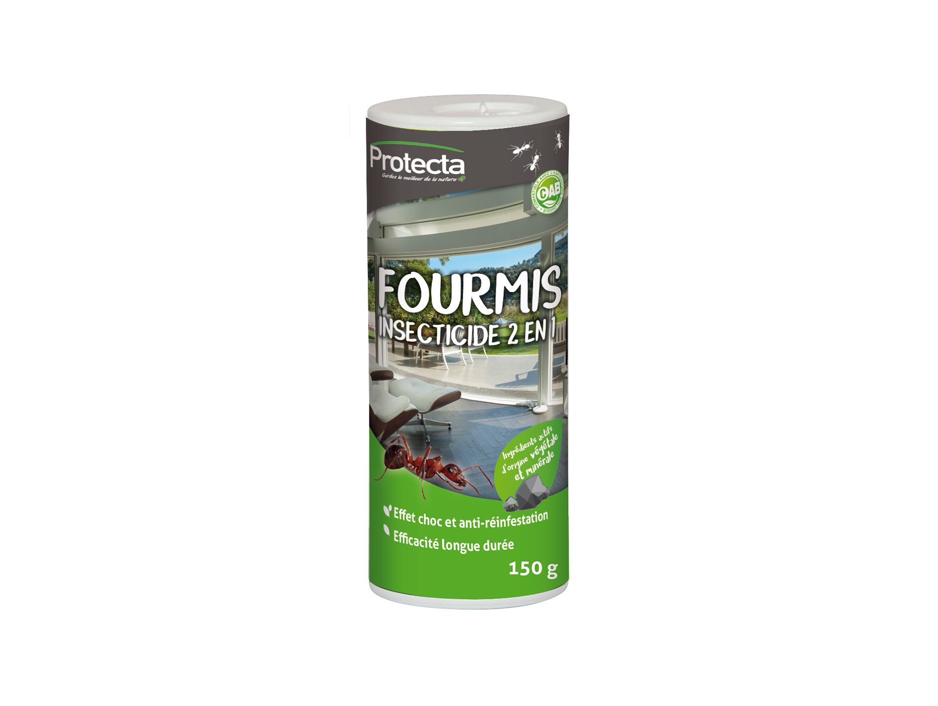 La poudre insecticide PROTECTA anti-fourmis 2 en 1 élimine rapidement les fourmis et autres insectes rampants grâce à son effet choc. Enrichie en pyrèthre végétal et terre de diatomée, elle agit de façon préventive et curative, créant une barrière minérale pour empêcher leur réinfestation. Idéale pour un usage intérieur ou extérieur, elle est compatible avec l?agriculture biologique.