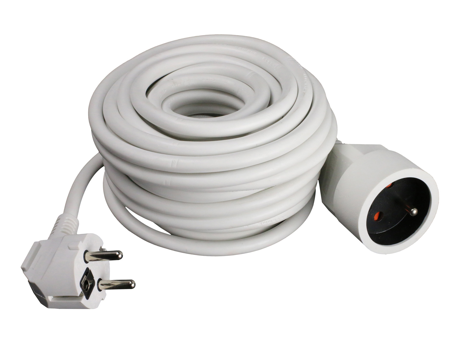 Rallonge 16A 2P+T électrique d'une longueur de 10 mètres. Convient à une utilisation sur chantier ou dans un milieu agité. Puissance max : 3680W - 230V. Normes CE et NF. Sécurité enfant. Câble HO5VVF 3G1,5mm². Coloris : blanc.