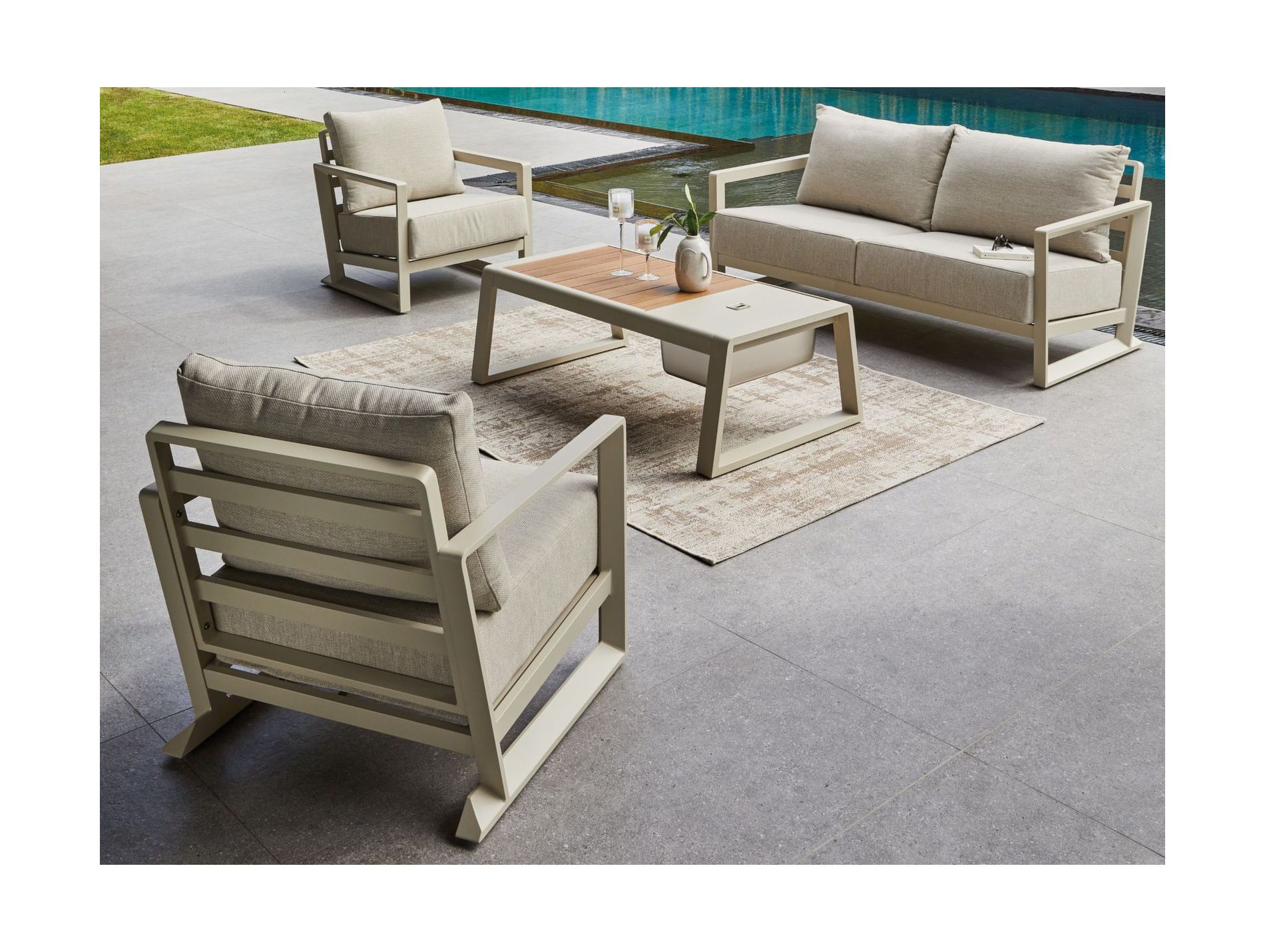Sa structure en aluminium apporte de la légèreté et convient à un usage extérieur. Les coussins déhoussables offrent un confort mi-ferme, tandis que leur tissu en polyester déperlant facilite l'usage au quotidien. La table basse intègre un bac amovible en inox pour garder les boissons au frais à portée de main.