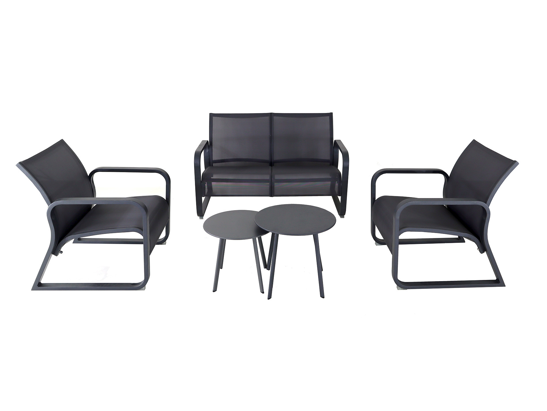 Avec son coloris graphite et ses lignes épurées, ce salon trouve facilement sa place dans différents aménagements extérieurs.