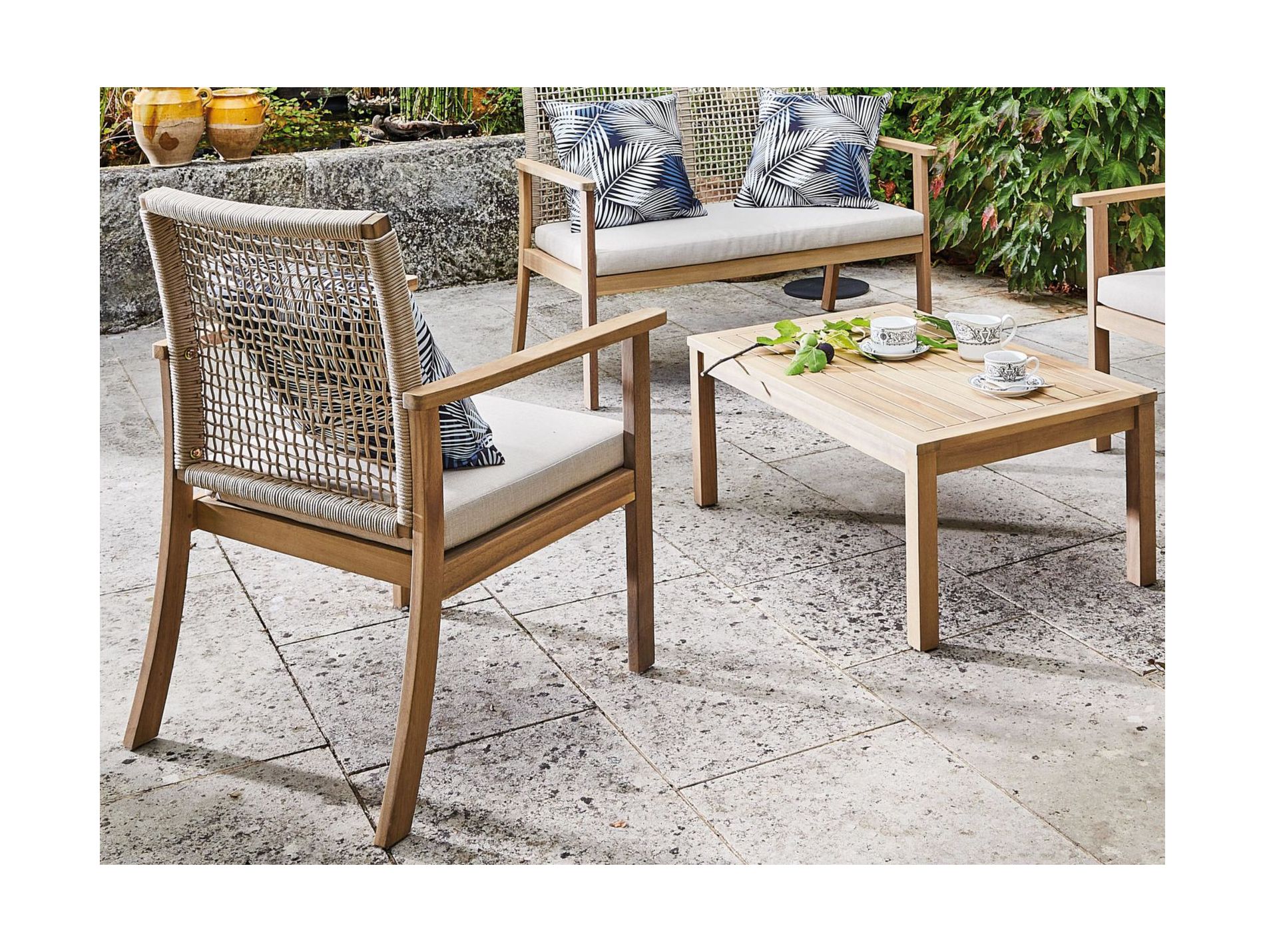 Sa structure en acacia FSC assure une bonne tenue dans le temps tout en apportant un aspect naturel. L'assise en résine tressée contribue à un entretien simple et à une utilisation adaptée en extérieur. Les coussins déhoussables en polyester offrent un confort agréable et facilitent le nettoyage au quotidien.