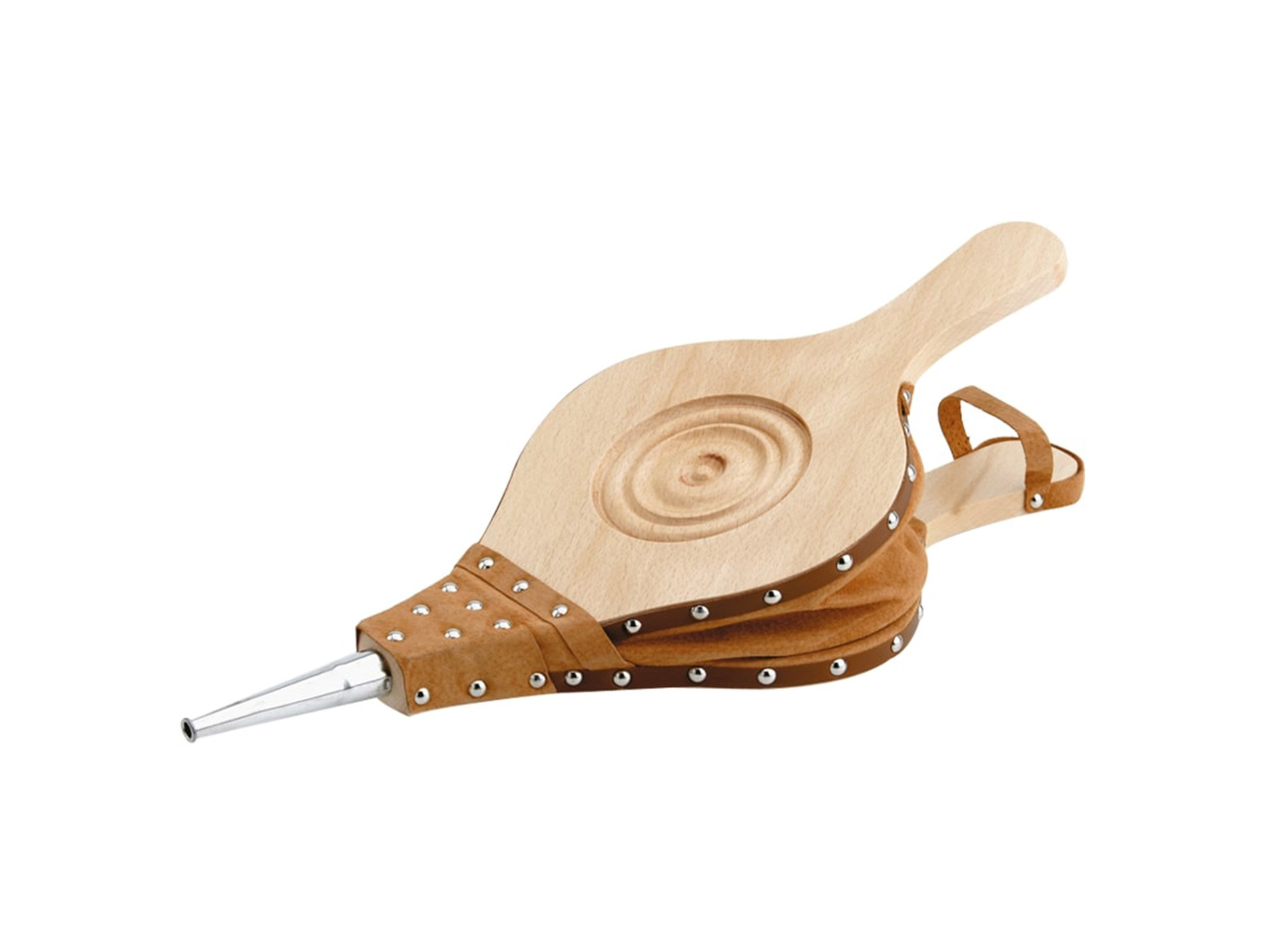 Soufflet Origine en hêtre naturel avec décor rosace. Couleur : Hêtre naturel verni, cuir caramel. Clous inox. Dimensions : L 19 cm X H 46.5 cm. Certifié PEFC.