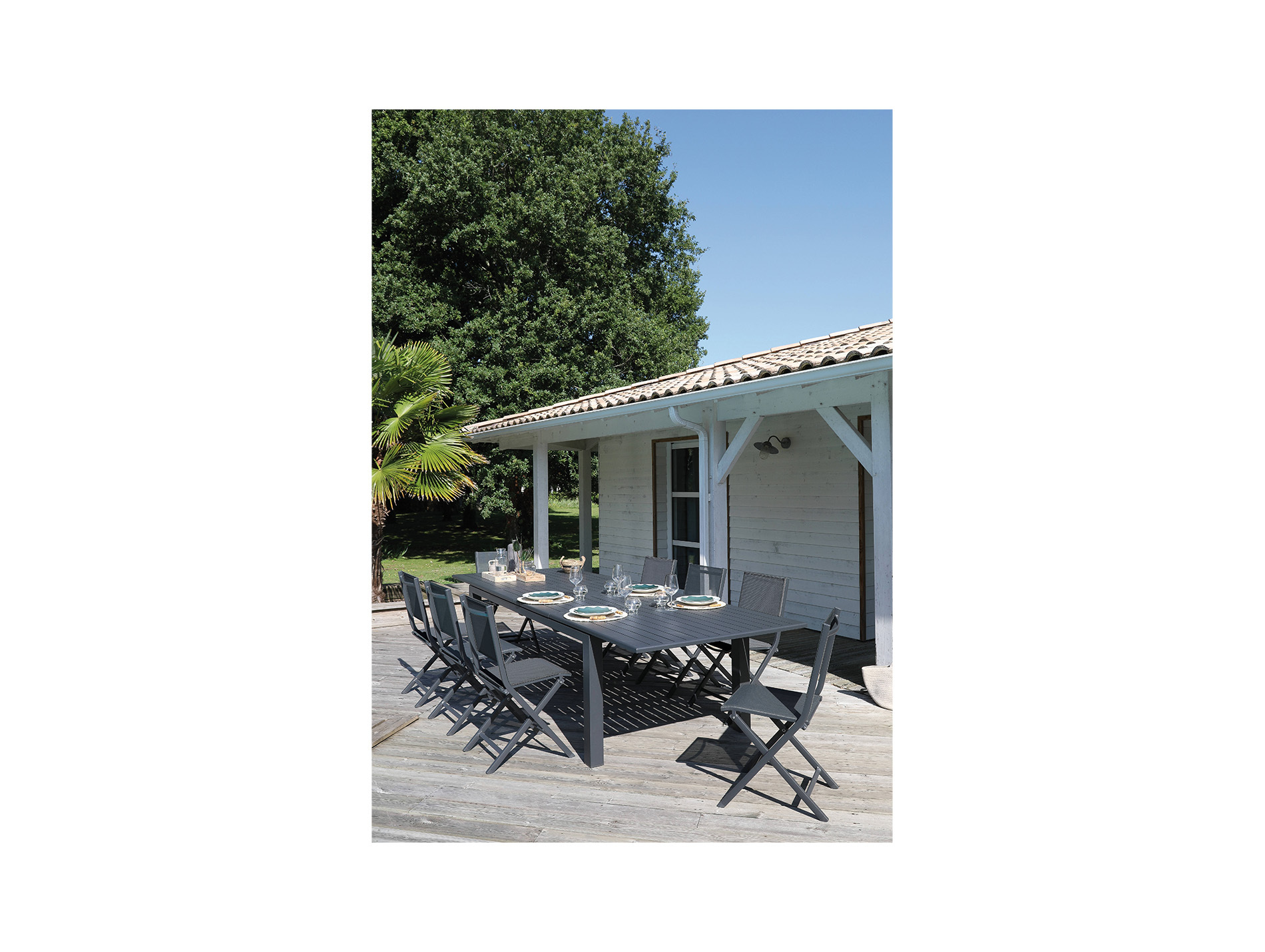 Avec son coloris graphite et son grand format, cette table permet d'aménager un espace repas généreux et pratique, pensé pour les extérieurs spacieux.
