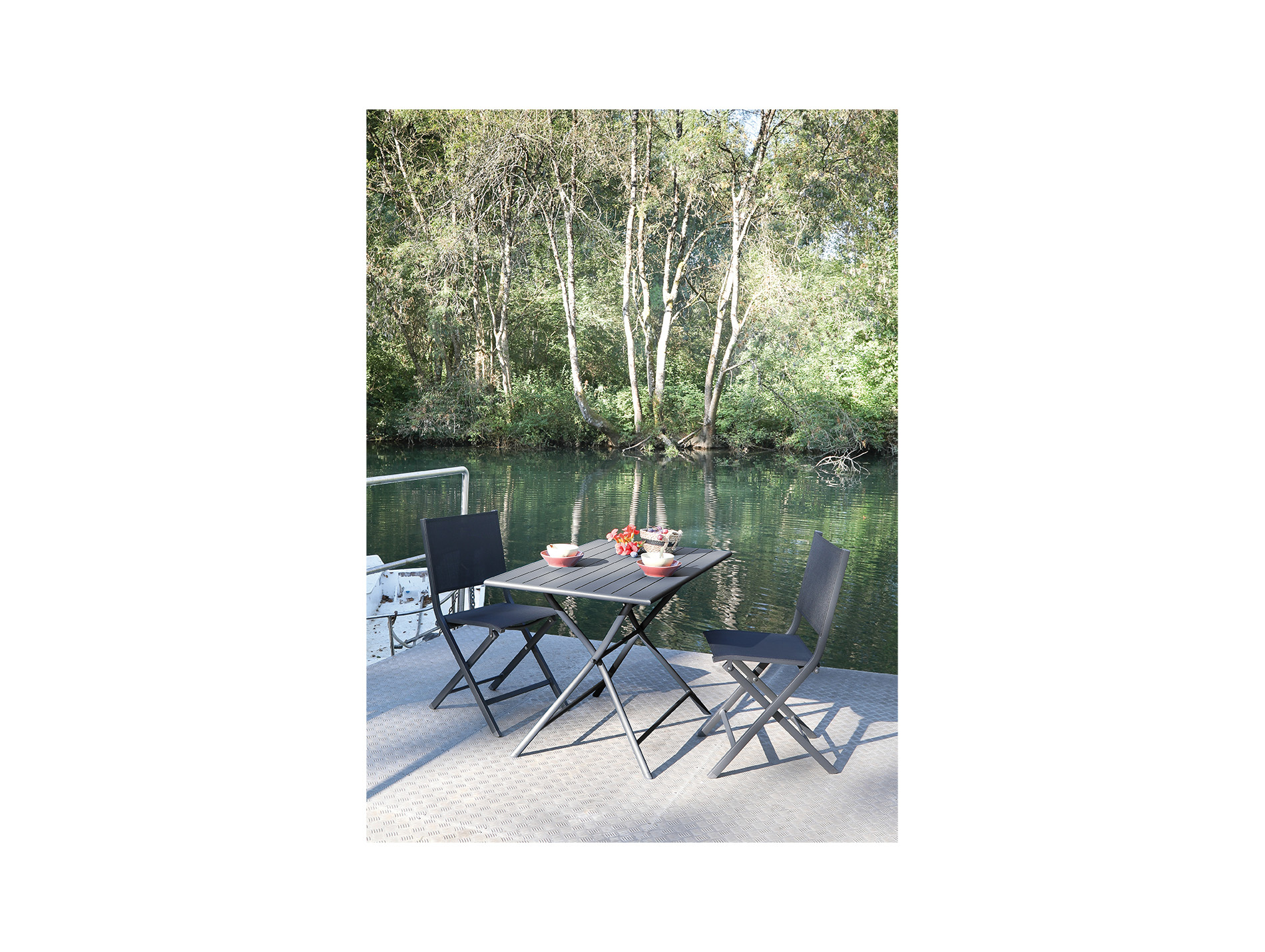 Sa structure en aluminium la rend facile à déplacer au quotidien, tandis que son plateau à lattes apporte une finition sobre et contemporaine. Son coloris graphite s'intègre facilement dans différents styles d'aménagement extérieur.