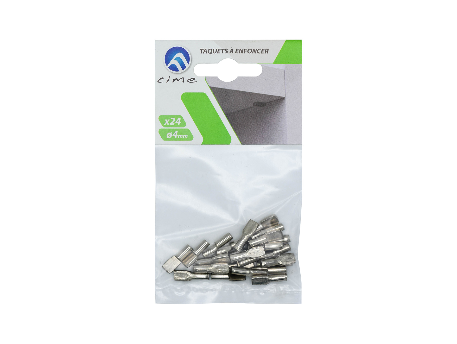Taquet d'étagère CIME à enfoncer. Perçage de 4 à 7 mm. Diamètre 4 mm. Acier nickelé. Par 24.