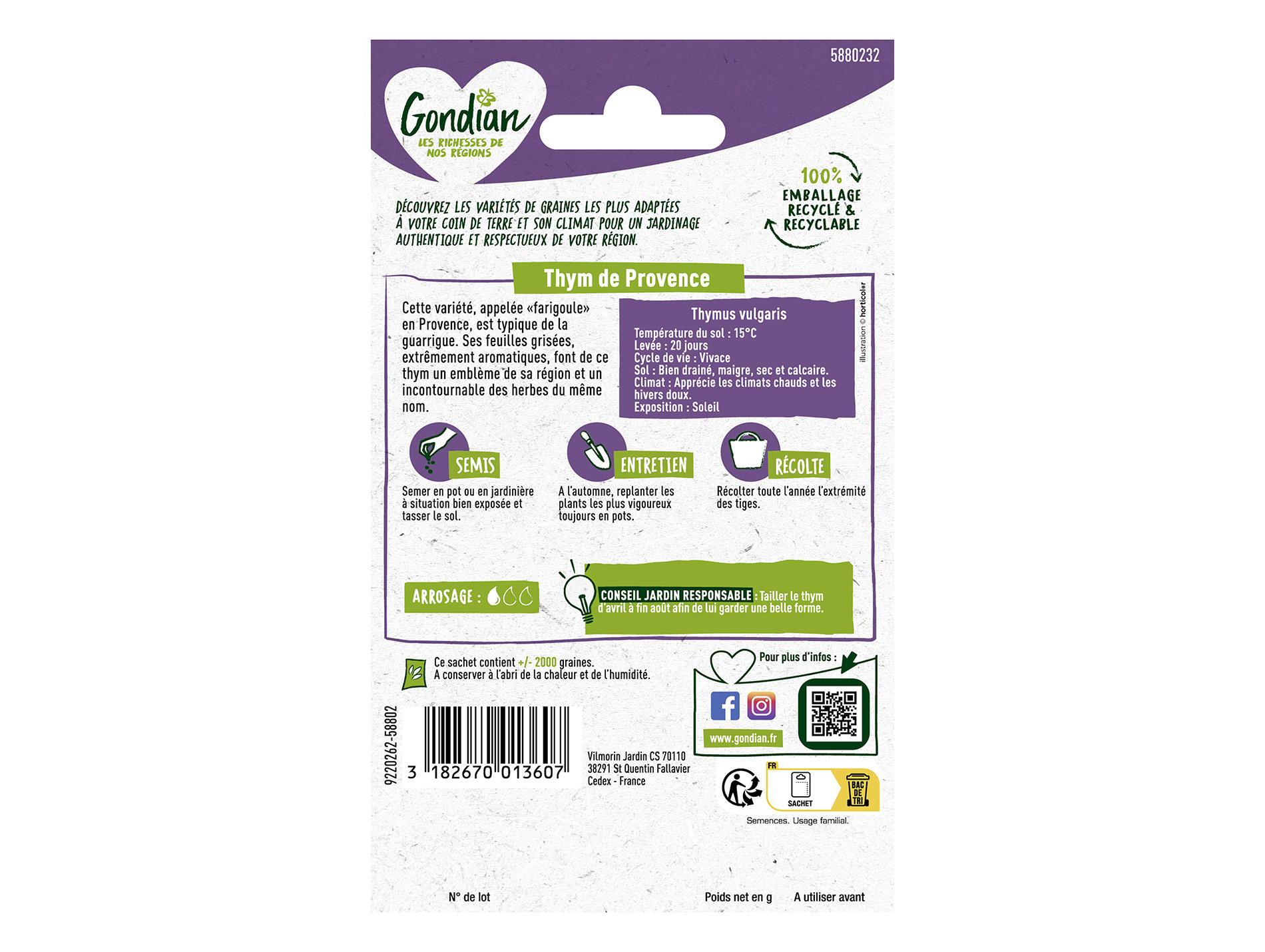 Le Thym de Provence, ou "farigoule", est une variété aromatique typique de la garrigue, appréciée pour ses feuilles grisées et extrêmement parfumées. Résistant au gel et nécessitant peu d'eau, il est un symbole des herbes provençales, parfait pour ajouter une touche de saveur à vos plats.
