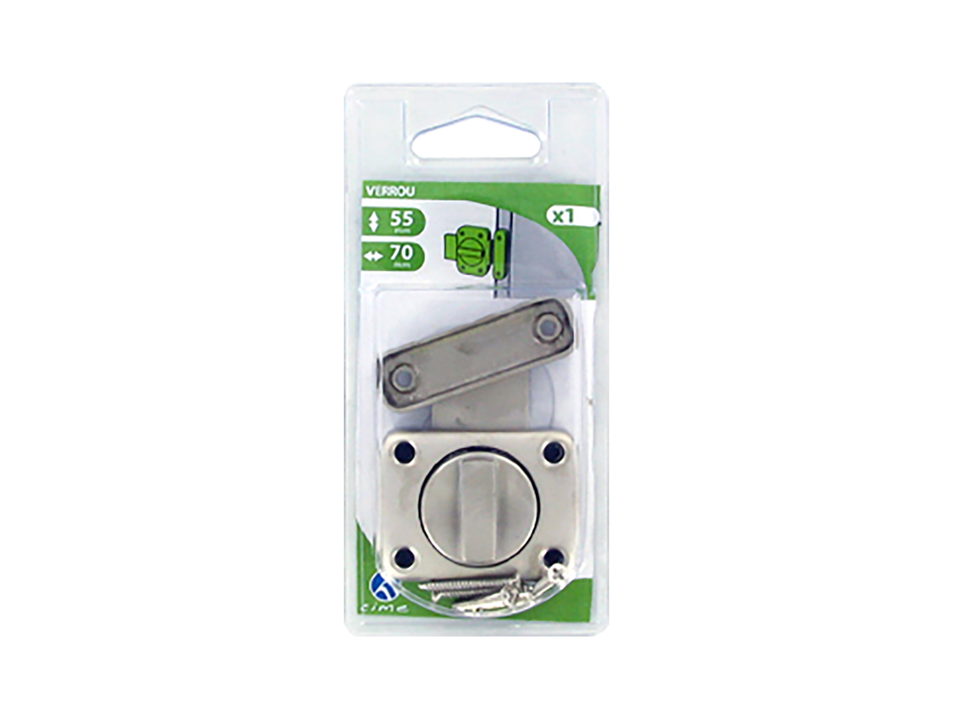 Verrou de meuble modèle design en zamak nickelé mat. Longueur 70 x hauteur 55 x épaisseur 25 mm.