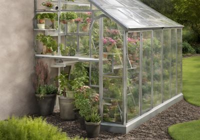 Une serre de jardin aux parois verticales vous permet d'optimiser la surface de culture en offrant la même hauteur à tous les plants. Vous pouvez également circuler aisément à l'intérieur de toute la structure.