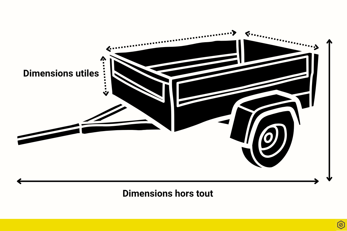 - Dimensions hors-tout : il s'agit des dimensions d'encombrement de votre remorque, comprenant la caisse, les roues et le système d'attelage, appelé timon. Cela vous permet de savoir si vous pouvez la garer dans votre garage ou votre allée.